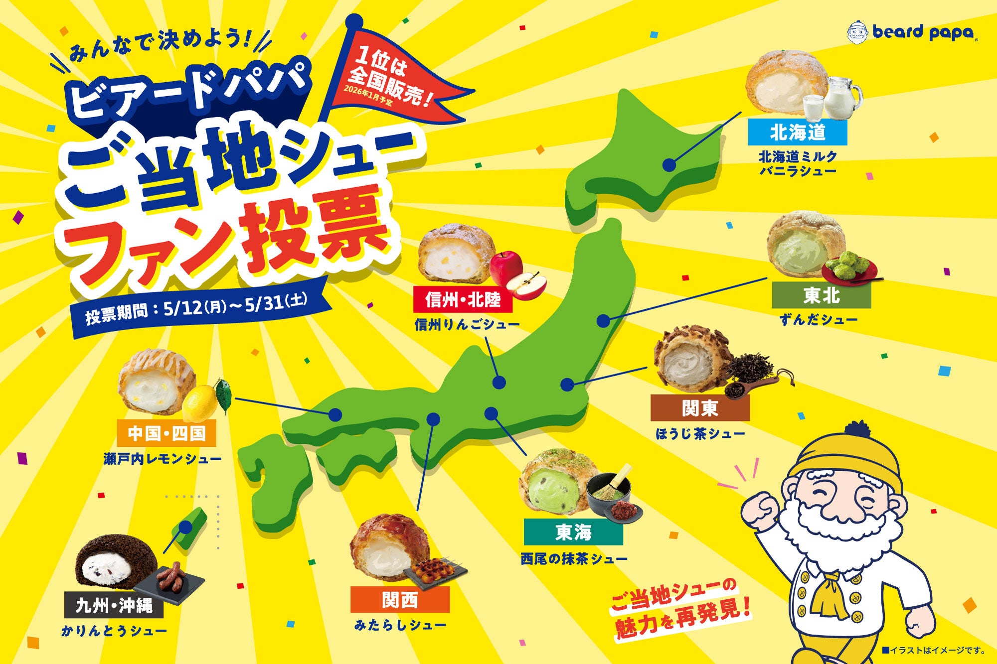 株式会社DAY TO LIFE(本社:大阪府大阪市北区、代表取締役:杉内健吉)が展開するシュークリーム専門店ビアードパパは、2025年5月12日(月)から5月31日(土)まで、ファンのみなさまからの投票によって全国販売する商品を決める“ビアードパパご当地シューファン投票”を開催しました。第2回目となる今回の投票企画では、全8種類のご当地シューがエントリー。驚きのフレーバーから、地域の特産品を使用した逸品、さらには一部店舗でしか味わえなかった限定シュークリームまで、個性豊かなご当地シューたちが全国販売の座をかけて頂点を競い合いました。投票総数はなんと17,898票。毎日欠かさず投票してくださった方もいらっしゃるほど、今回のイベントも大いに盛り上がりました。ビアードパパのファンのみなさまに心より感謝申し上げます。