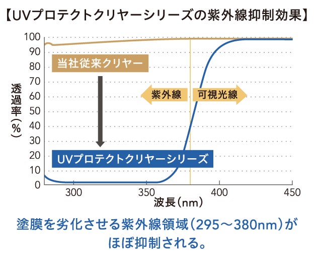 紫外線は人の健康や環境への影響度の観点から、波長によってUV-A(315~380nm)、UV-B(280~315nm)、UV-C(200~280nm)の3つに分けられます。この内、地表に届き私たちの生活に影響を与えているのは295nm以上の紫外線であり、皮膚など人体に悪影響を及ぼすように、塗膜の劣化を進めてしまいます。ピュアライドUVプロテクトMKクリヤーは、シリーズ最上位の耐久性で塗膜面の劣化を長期にわたり保護します。