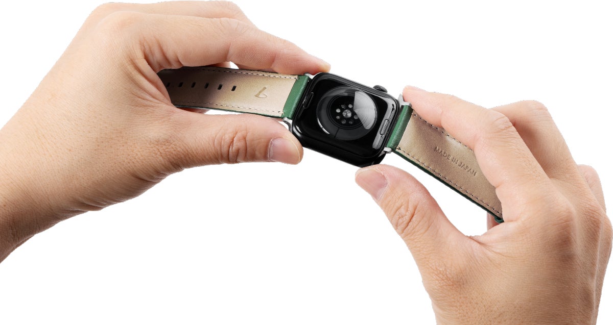 Apple Watch42・44・45mm用と38・40・41mm用の2タイプを展開。長さは男女問わずお使いいただけるよう、9段階で調整可能です。挿し込みながらスライドさせるだけで、Apple Watchに簡単に装着・脱着できるようになっています。