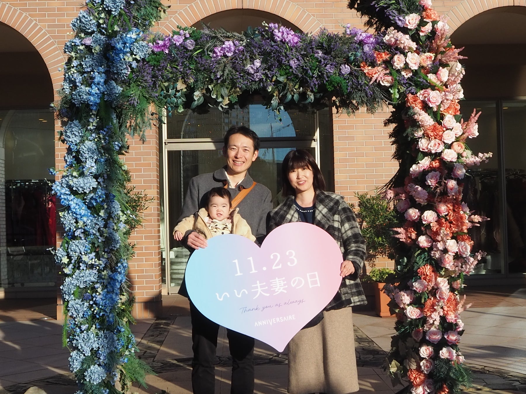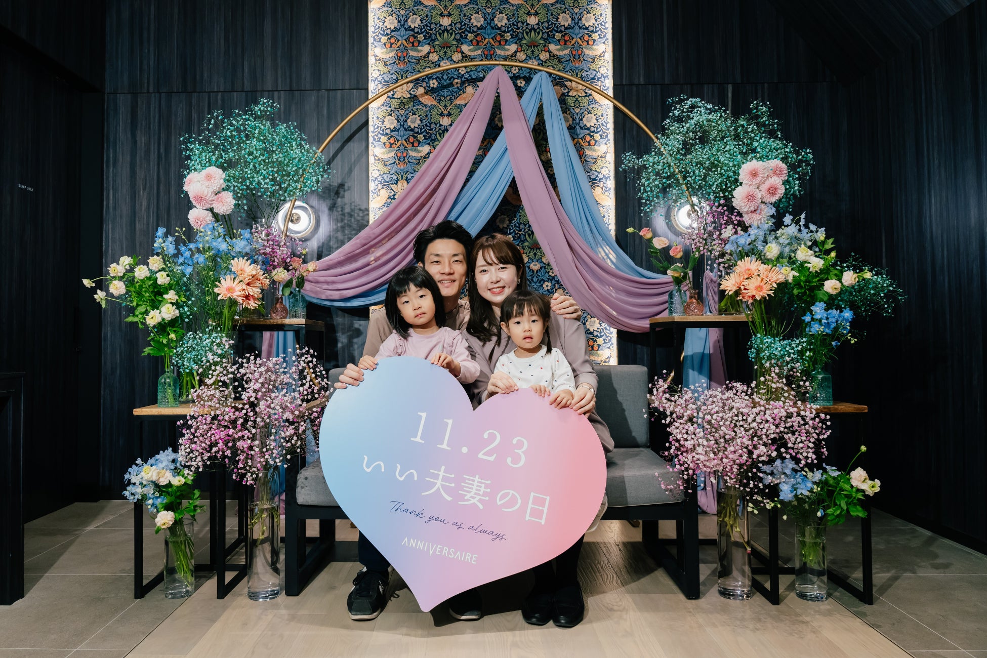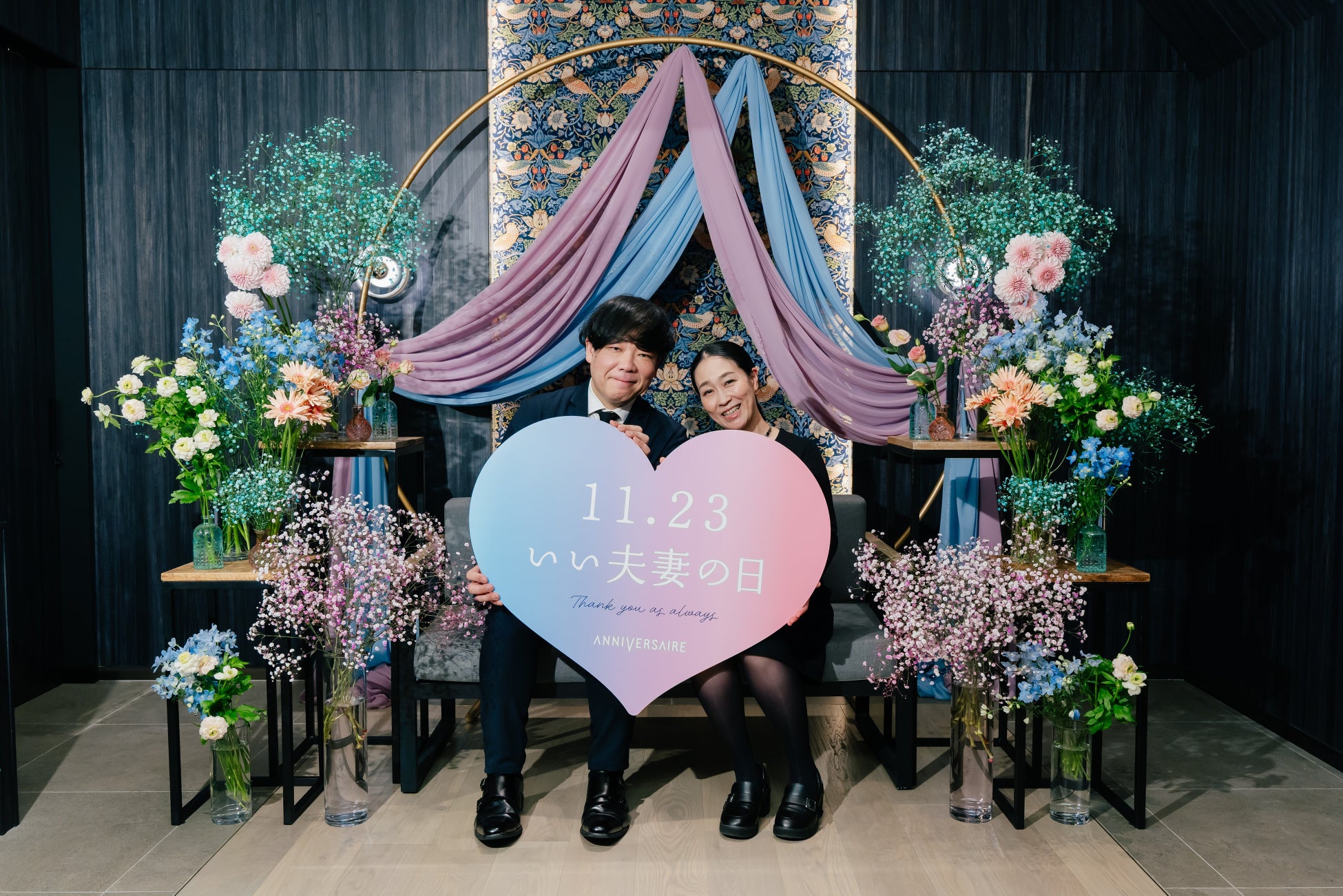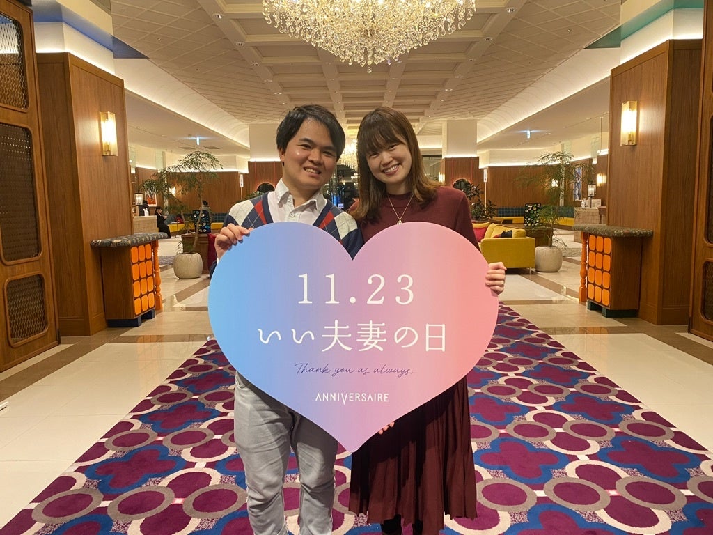 最上階の会員制レストラン「TERRASSE」を11月23日(土)限定で一般開放し、ランチ・ディナーそれぞれシェフこだわりのコース料理をご堪能いただきました。特別装飾のフォトスポットにて、「11.23 いい夫妻の日」をテーマにしたハートパネルをもってプロカメラマンによる記念撮影も実施いたしました。また、21年前にアニヴェルセルで挙式されたお客様が “久しぶりにふたりの時間を大切にしたい”とご来館いただきました。