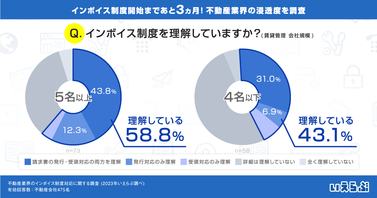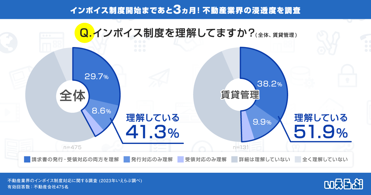 「2023年10月に実施されるインボイス制度に対して、あなたの状況を教えてください」という質問に対して「請求書発行側のみ理解」「受領側のみ理解」「両方を理解している」と回答した不動産会社は41.3%と、半数以下の会社にしか理解が進んでいません。