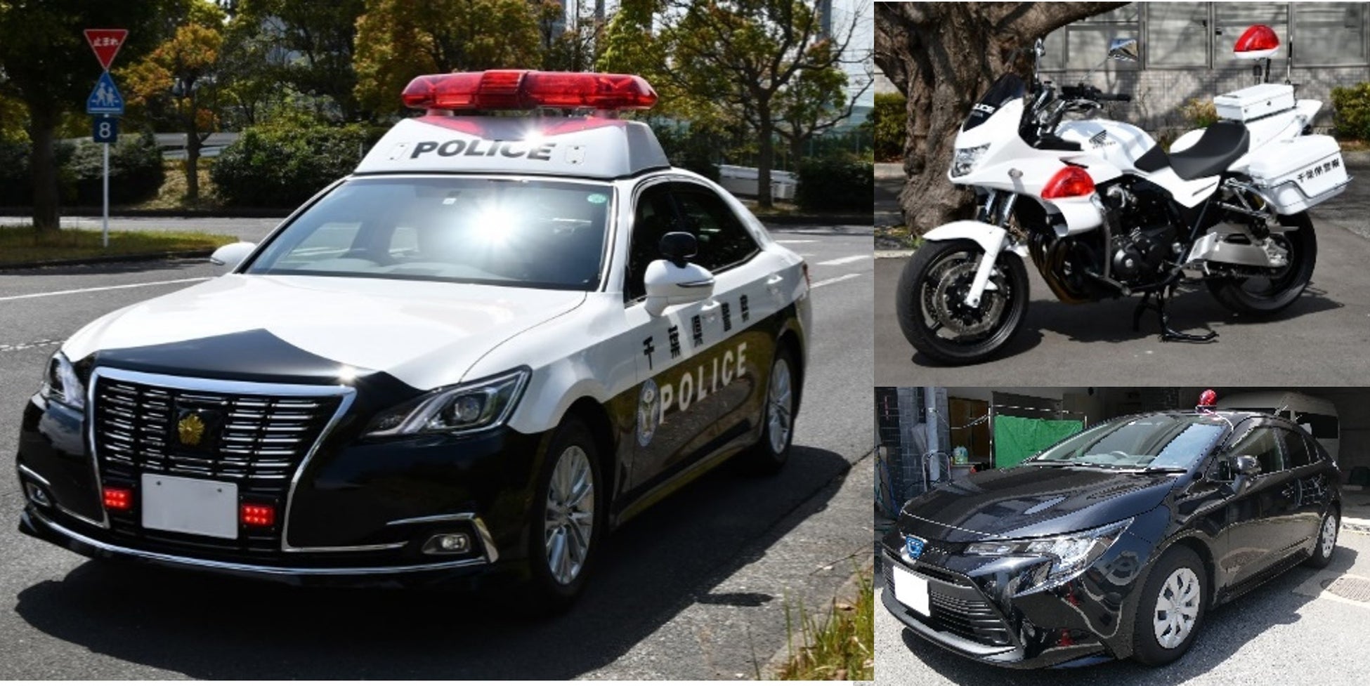 :パトカー(トヨタクラウン、1台)、覆面パトカー(トヨタアリオン、1台)、白バイ(CB1300 2台、VFR800 1台)、移動交番車(日産シビリアン、1台)