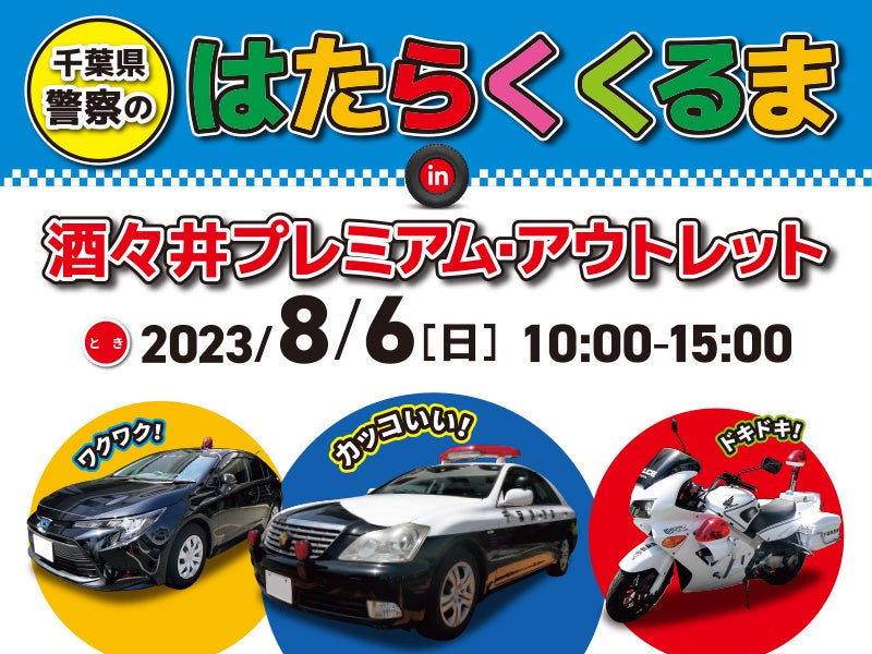 本イベントでは、千葉県警察本部および佐倉警察署の協力のもと、地域の安全を守る警察車両をアウトレット内に展示します。白黒のパトロールカーや捜査用の覆面パトカー、最新式の白バイなどの警察車両を、間近で一同に見ることができます。