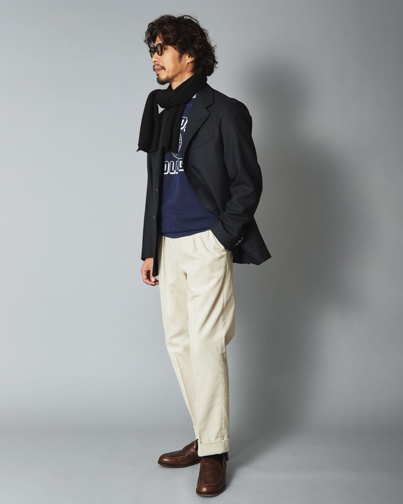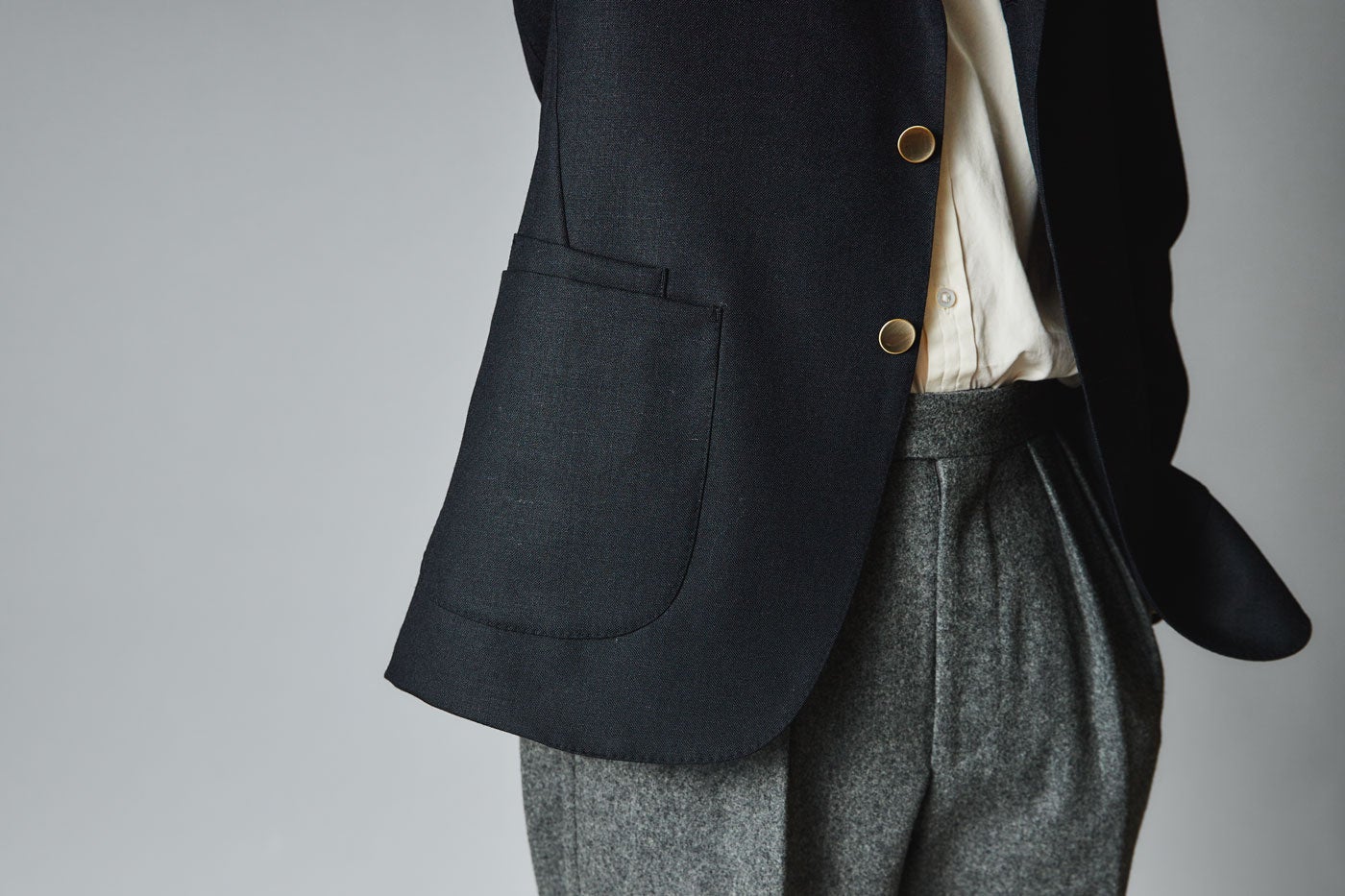 「目下、久々の紺ブレブームに沸くファッション業界。その影響でかつてないほど多くのブランドから紺ブレが登場していますが、それらは概して、昔ながらのスタイルを忠実に踏襲したトラッド系、イタリア仕立ての影響を受けたドレス系、ルーズフィットなデザイナーズ系の3種類のみ。でも僕としては、それらの中間をゆくバランスが理想的でした。直球のトラッドでもなく、ドレス系よりも気楽に着られて、それでいてあくまで大人っぽい。そんなバランスの紺ブレが欲しかったんです。後で解説するとおり、1920年代の英国ジャケットにも通じる特徴を備えていますが、ヴィンテージ回顧というよりもあくまで“今のクラシック”を追求してたどり着いたバランスですね」(四方さん)