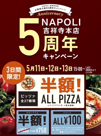株式会社遠藤商事・Holdings.(本社:東京都渋谷区、代表取締役:遠藤優介)は、「PIZZERIA BAR NAPOLI (ピッツェリア バール ナポリ) 吉祥寺(東京都武蔵野市吉祥寺本町2-16-12 三次ビル1F~3F)」にて、「オープン5周年記念還元祭」を開催致します。 キャンペーン期間中の5月11日〜5月13日の各日15:00以降に、オープン5周年記念として4つのお得なサービスを実施致します。1つ目は、同店舗で提供中の定番ピッツァ「マルゲリータ」や、女性にも大人気の「クアトロフォルマッジ」をはじめとした本格窯焼きピッツァ全27種類を全て半額にてご提供いたします。2つ目として、チキングリエ(通常1500円)も5周年特別価格の750円でご提供致します。3つ目は、人気の「生ビール(カールスバーグ)」「ジムビーム ハイボール」「グラス ワイン(赤/白/スパークリング)」や「ソフトドリンク」各種を1杯各100円でご提供致します。4つ目は、期間中に「PIZZERIA BAR NAPOLI 吉祥寺」をご利用いただいたお客様へ次回ご来店時にご利用できる「マルゲリータ」1枚無料券をプレゼント致します。◼︎ 「PIZZERIA BAR NAPOLI吉祥寺」5周年!