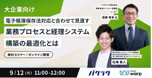 LayerX、アステリアの共催で、大企業向けに電子帳簿保存法対応と並行した業務プロセスと経理システム構築について解説します。