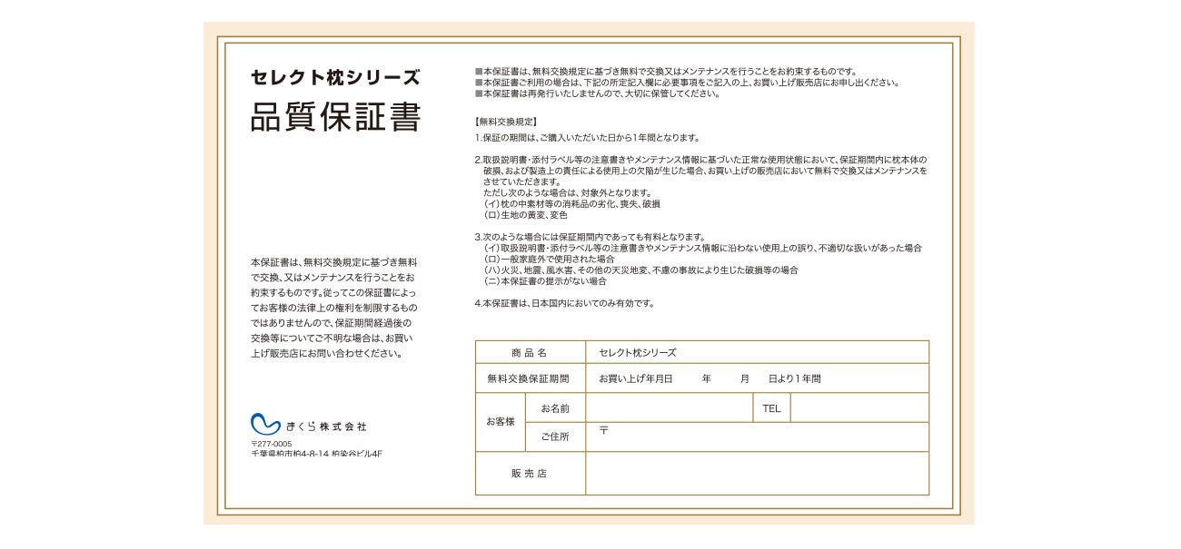良い品質で毎日安心してお使いいただけるよう、枕には1年間の品質保証書をお付けしてお届けしております。