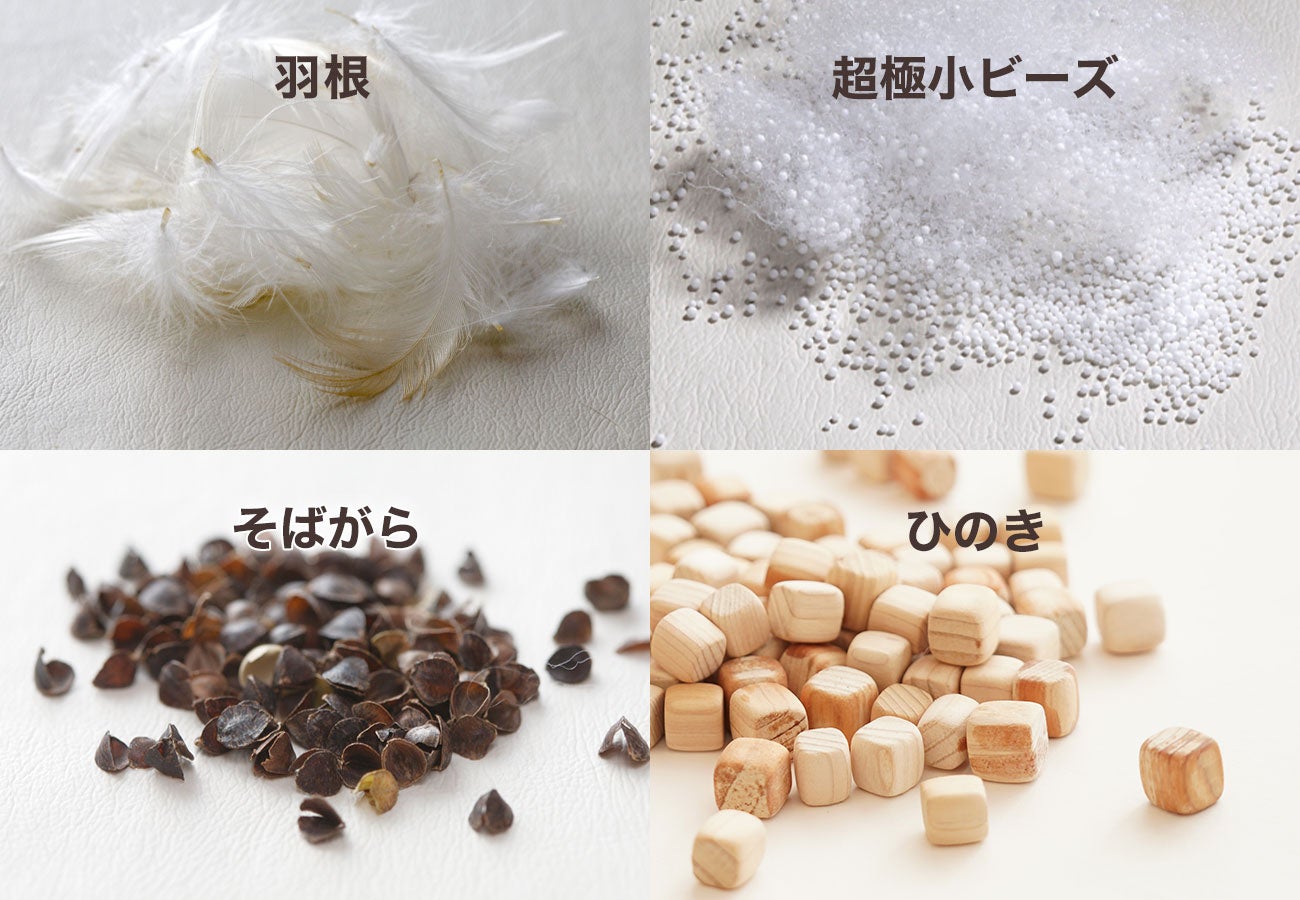 備長炭パイプ、ハードパイプ、モチコロール、シリコンパイプ、ポリエステルわた、つぶわた、高反発キューブウレタン、低反発キューブウレタン、羽根、超極小ビーズ、そばがら、ひのき