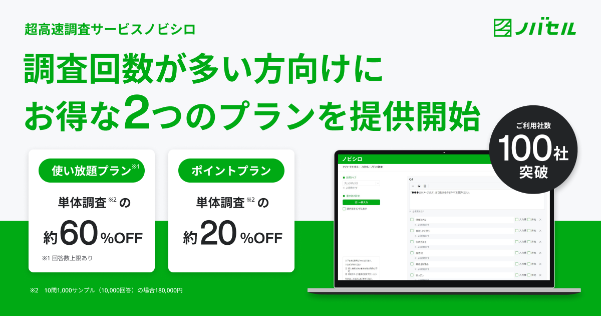 導入企業100社を突破したノバセルの超高速調査サービス「ノビシロ」、調査回数が多い方向けにお得な2つのプランを提供開始