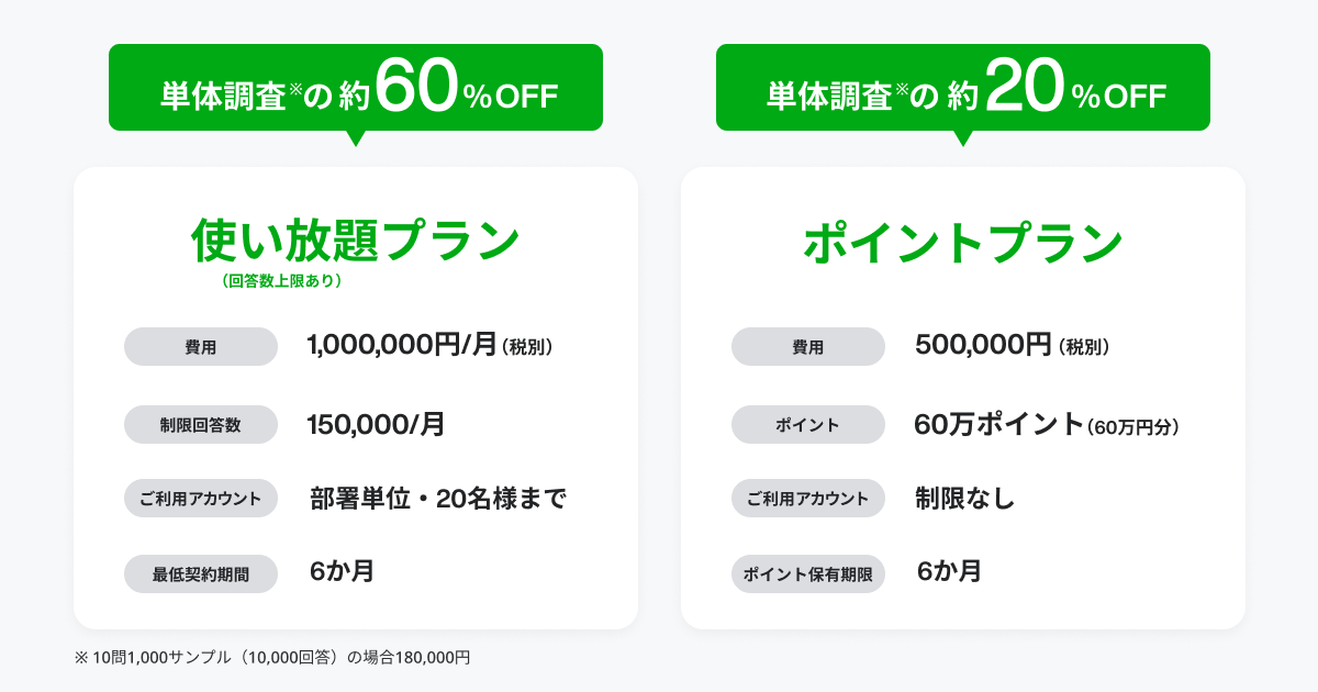 こうした背景を受け、企業の最適なマーケティング活動を支援すべく、月々の調査回数が多い方向けに、これまでより気兼ねなく調査ができる、使い放題(回答数上限あり)プランとポイントプランを用意いたしました。