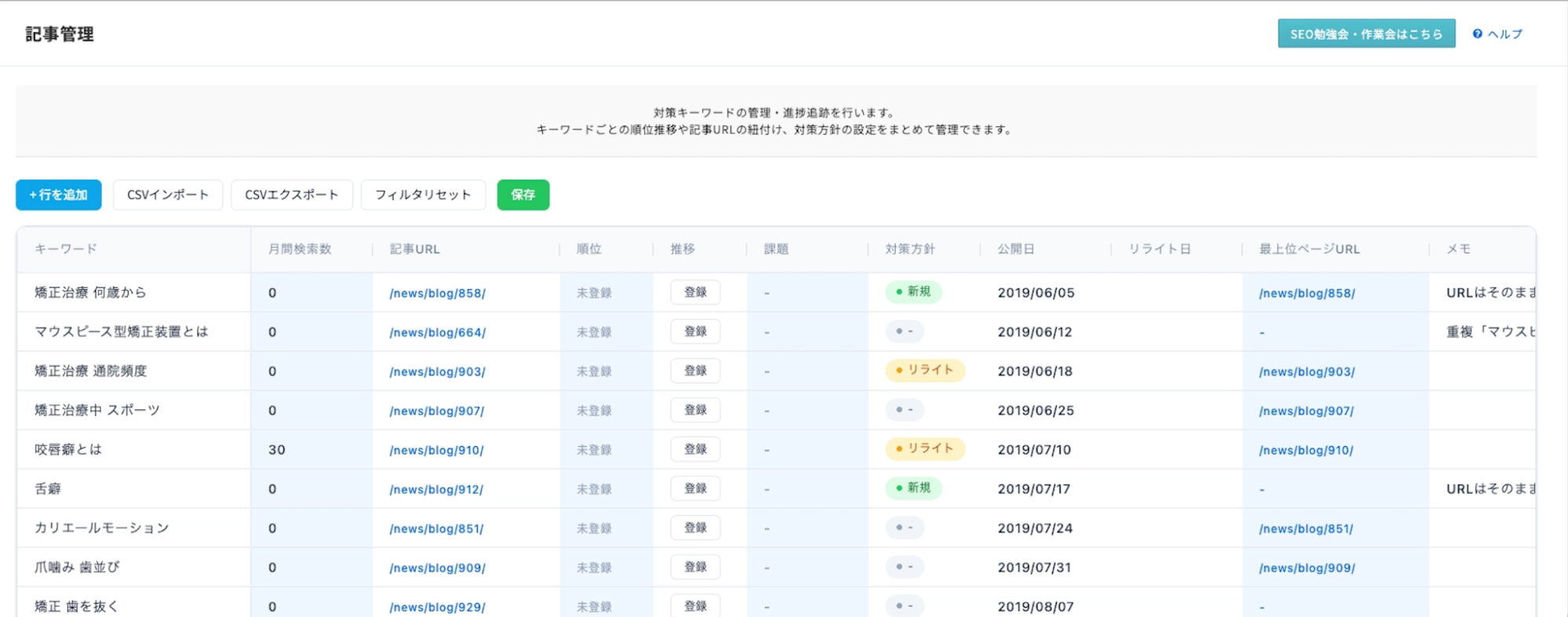 取得した順位データをもとに、そのままTACT SEO上で改善方針の検討を行うことが可能です。本画面から順位計測機能への登録も行えるほか、検索ボリューム順や順位順でのソート・フィルタ機能も備えており、データ分析から上位表示に向けた次のアクションへのPDCAサイクルをスムーズに回すことができます。