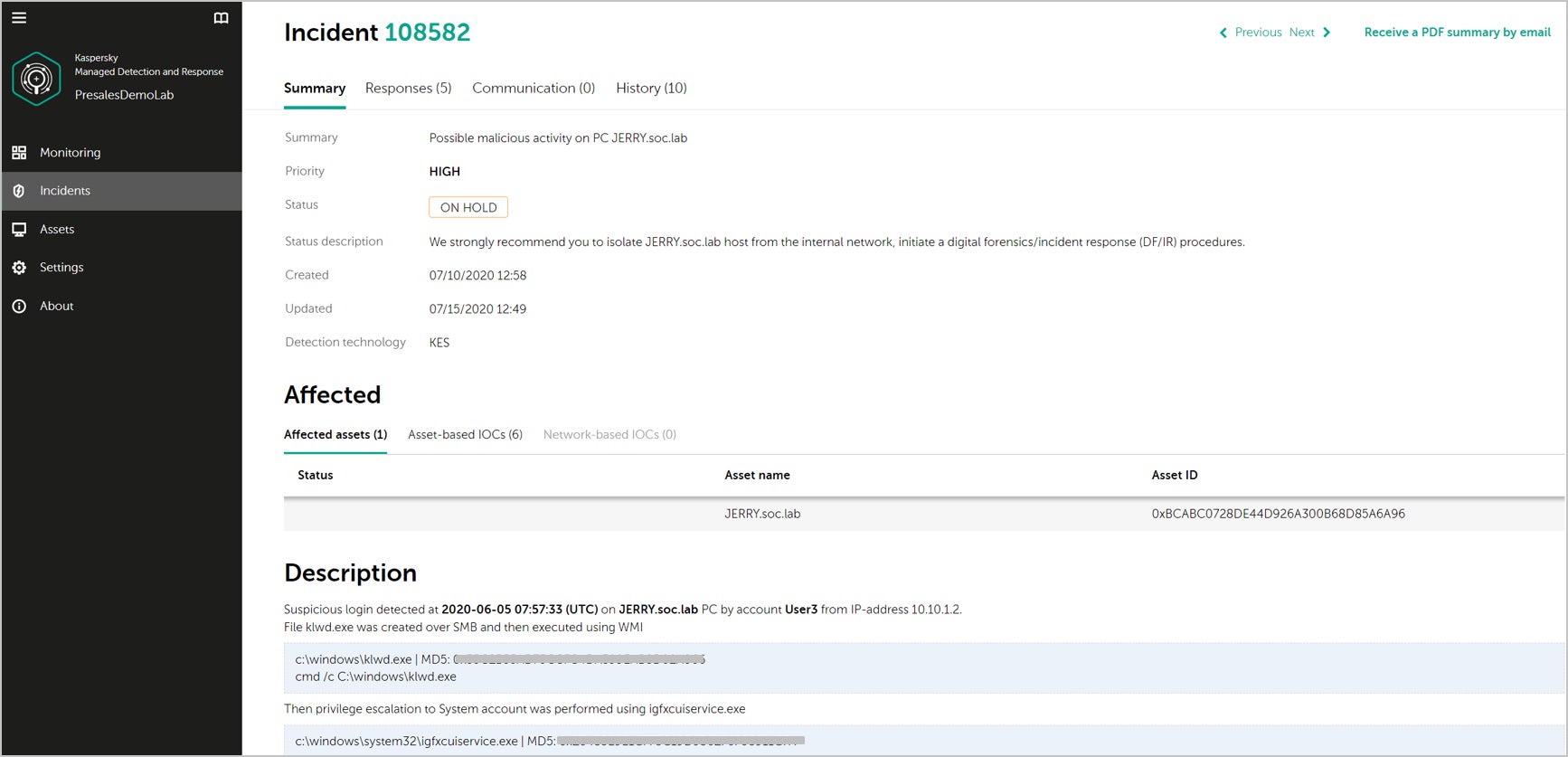 24時間365日の監視、さまざまな検知エンジンによる自動脅威ハンティング、当社SOC専門家によるインシデントの検証と調査、インシデント対応時の詳細なガイドおよびそのPDF形式の結果レポートが含まれます。Kaspersky MDRのWebポータルでは、ダッシュボードの表示、端末のセキュリティ状態とレポートが確認できます。インシデントログ保持期間は1年間、テレメトリデータの保持期間は1カ月です。