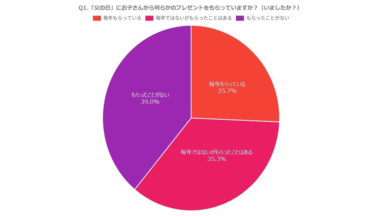 始めに「父の日にお子さんからプレゼントをもらったことがあるか」を聞いたところ、「毎年もらっている」25.7%、「毎年ではないがもらったことはある」35.3%で、「もらったことがない」という回答が39.0%でした。
