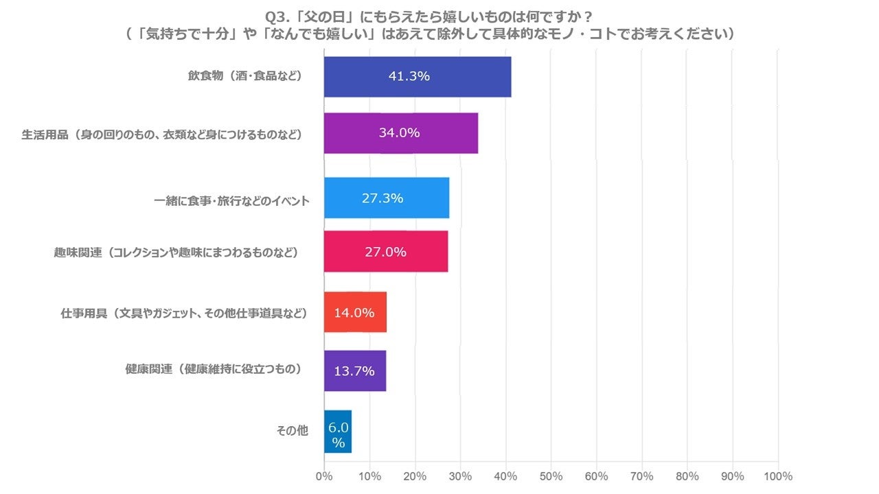 「父の日にもらえたら嬉しいものは何ですか?」を、“気持ちで充分”や“何でも嬉しい”はあえて除いて具体的なモノ・コトで聞いたところ、1位は「飲食物」が41.3%と最多。続いて「生活用品」の34%、「一緒に食事・旅行などのイベント」が27.3%と続きました。