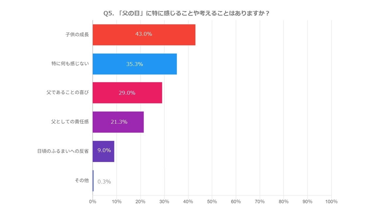 「 父の日に特に感じることや考えることはありますか? 」と尋ねたところ、「子供の成長」を感じるとの答えが43.0%と1位であった一方、「特に何も感じない」が35.3%と続く結果に。