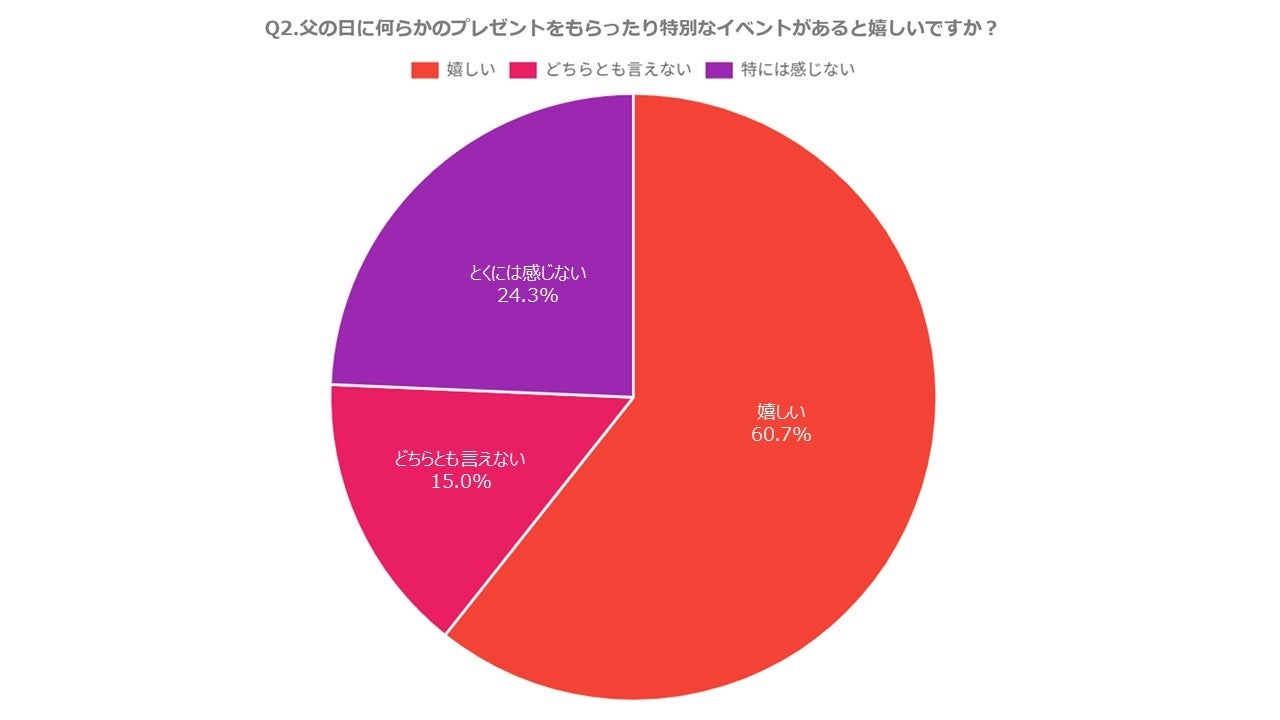 「父の日になんらかのプレゼントをもらったり特別なイベントがあると嬉しいですか?」と尋ねると、60.6%のお父さんは「嬉しい」と回答。一方で「とくには感じない」24.3%「どちらともいえない」15.0%と、およそ4割のお父さんが「父の日」を特別視していない実態も判明しました。詳しく理由を聞くと「普段の日と変わらない」「特別感は無い」など習慣化していないといったものや「経済的負担をかけるから」や「気を遣わせたくない」など、子供を気遣う意見も見られました。