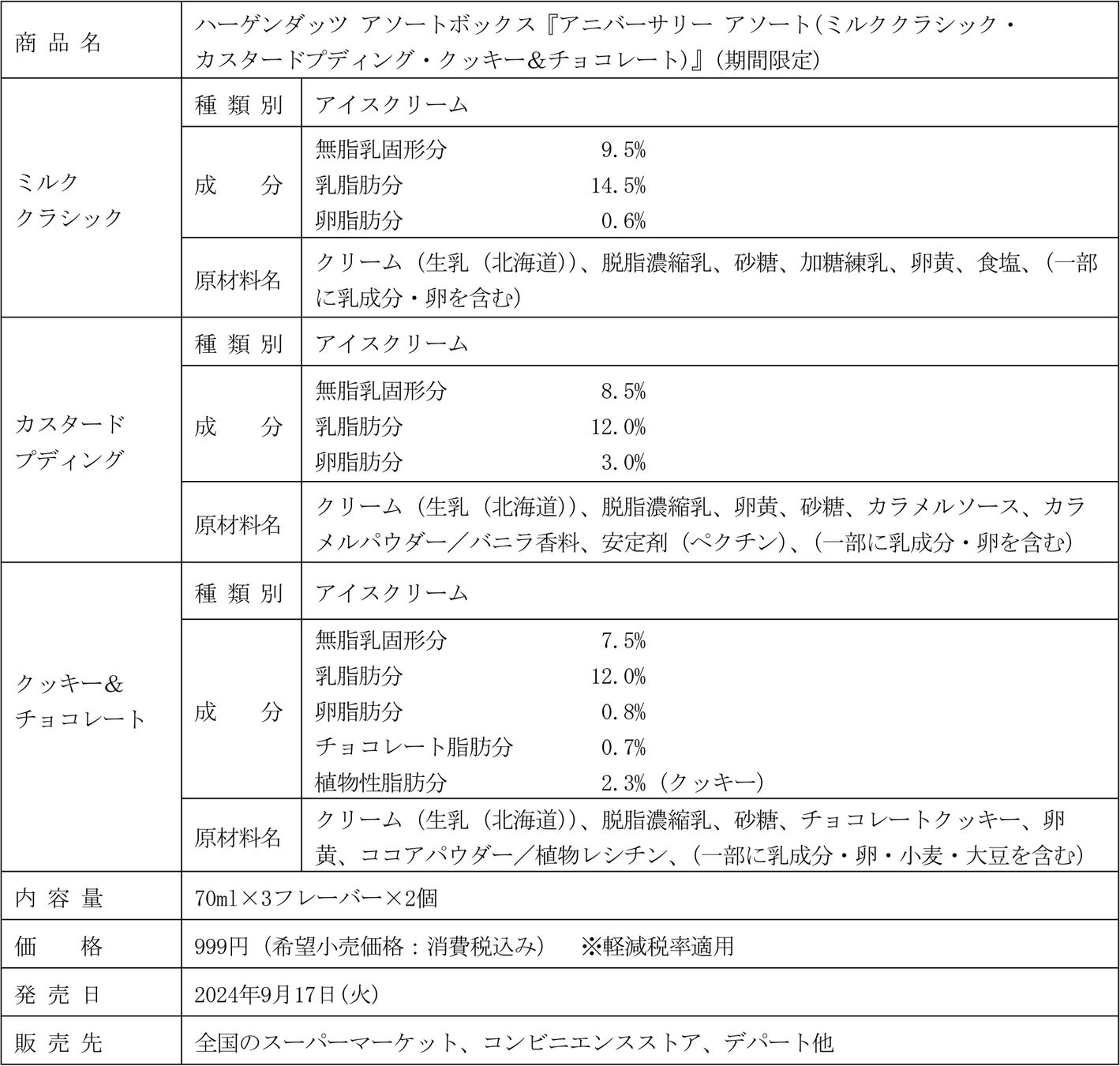 ハーゲンダッツ ジャパン株式会社(本社:東京都目黒区、社長:五十嵐享子)は、アソートボックス『アニバーサリー アソート(ミルククラシック・カスタードプディング・クッキー&チョコレート)』を9月17日(火)より期間限定にて全国で新発売します。