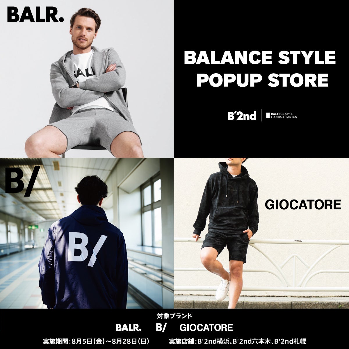 バランススタイルからは、既にB'2ndでも人気を誇るオランダ発の「ボーラー(BALR.)」に加え、サッカー選手やフィギュアスケーターなど多くのスポーツ選手を虜にする「ビースラッシュ(B/)」や「ジョカトーレ(GICATORE)」が登場いたします。