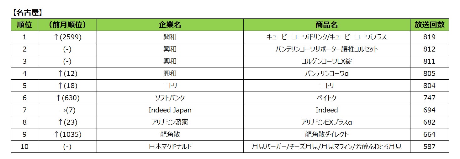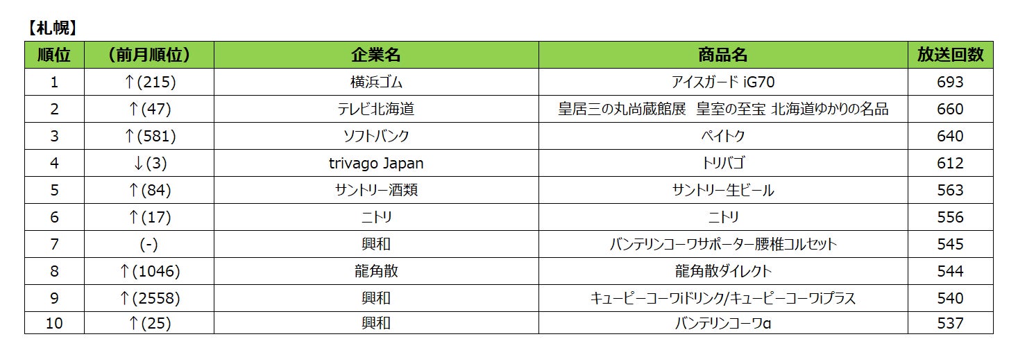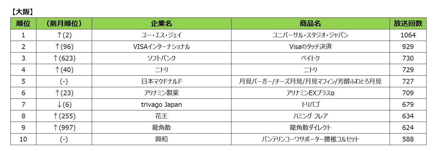 1位のUber Eats Japan「ウーバーイーツ」と、2位のIndeed Japan「Indeed」はこれまでも東京地区を中心に出稿しておりましたが、今月は東京地区のCM放送回数ランキングにおいて、いずれも上位にランクイン。また、セブン-イレブン・ジャパンの宅配サービス「7NOW」が7位に初登場し、東京地区における宅配サービスの需要の高さを感じる結果となりました。