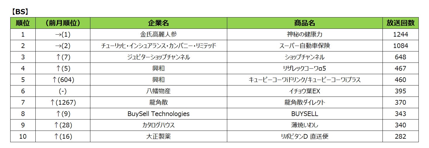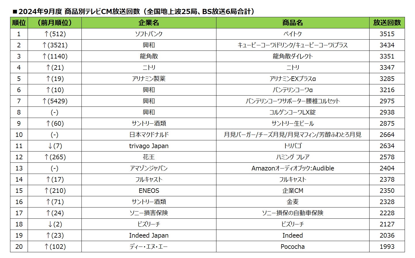2024年9月度 商品別テレビCM放送回数(全国地上波25局、BS放送6局合計)