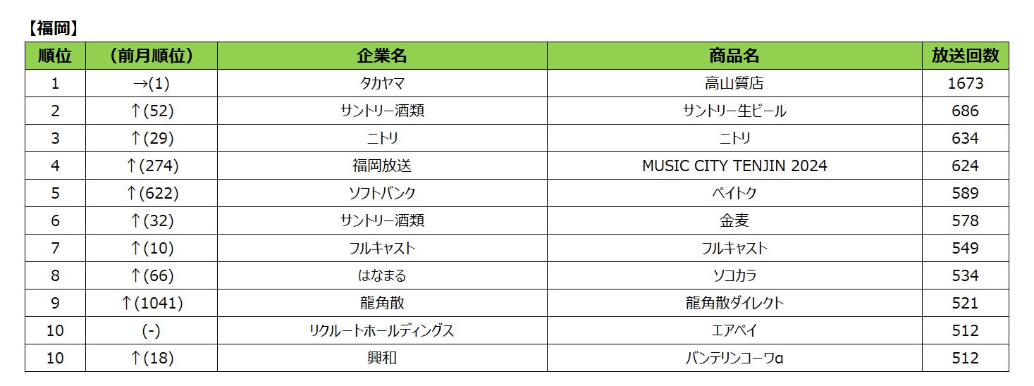 2024年9月度 エリア別テレビCM放送回数ランキング