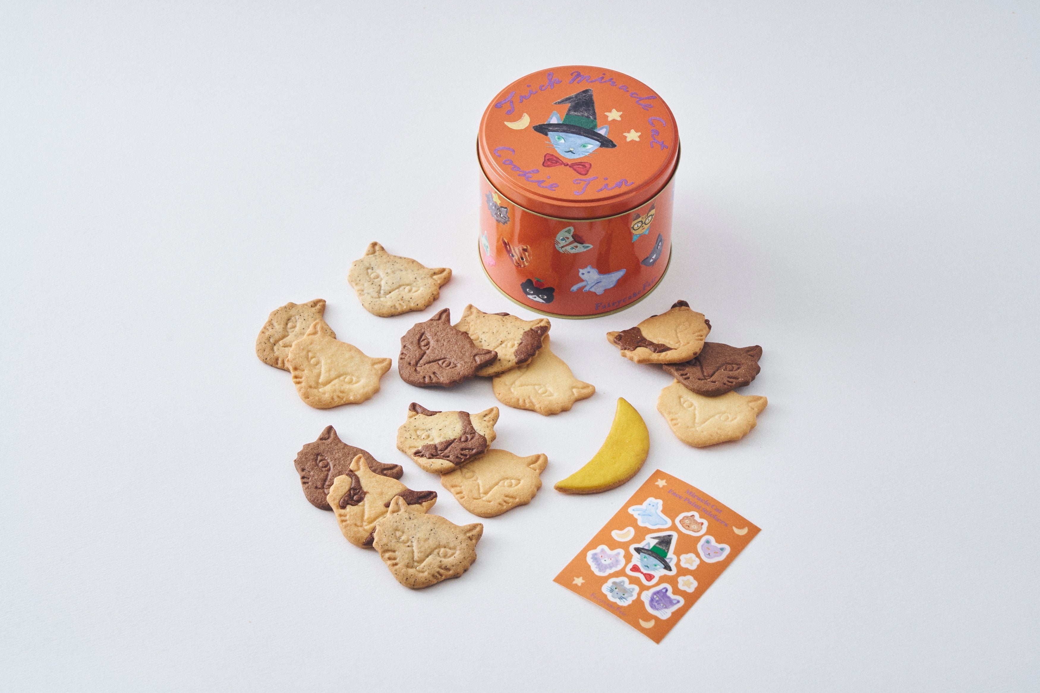 ミュージシャン・坂本美雨さん、イラストレーター・前田ひさえさん、フェアリーケーキフェアがコラボレーションした人気シリーズ「“神様のいたずら”ネコクッキー缶」に、ハロウィン限定バージョンが登場。新色のハロウィンカラーデザイン缶に、限定の三日月型レモンアイシングクッキーと、定番ネコクッキー5種を詰め合わせた全15枚入り。すべて個包装で、お配りスイーツにも最適です。缶はそのまま“お菓子バケツ”としても活用可能。