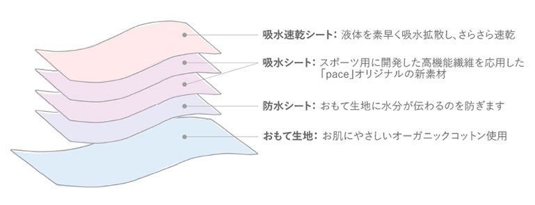 着用感を重視し、吸水量は35mlと50mlの2タイプ。不安な時はナプキンと併用できるよう、おもての生地と吸水パッドを縫い付けない羽つきナプキン対応仕様です。吸水パッド内部の吸水シートにはスポーツ用に開発した高機能繊維を応用した「pace」オリジナル新素材(※1)を使用。吸水量や体調変化を見逃さないよう、吸水パッドの色をグレーにしています。