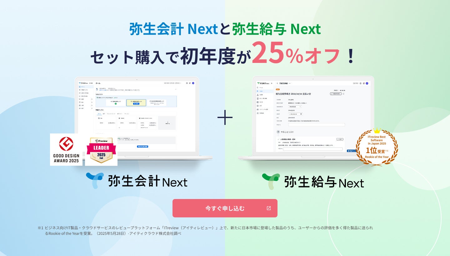 弥生株式会社(本社:東京都千代田区、代表取締役 社長執行役員 兼 CEO:武藤健一郎、以下「弥生」)は、提供する法人向けクラウド会計サービス「弥生会計 Next」とクラウド給与サービス「弥生給与 Next」を同時にお申し込みいただくことで、初年度の利用料金が通常価格から25%割引となる新プランの提供を開始したことをお知らせいたします。これにより、それぞれのサービス単品でのご契約よりもコストを抑えることができます。