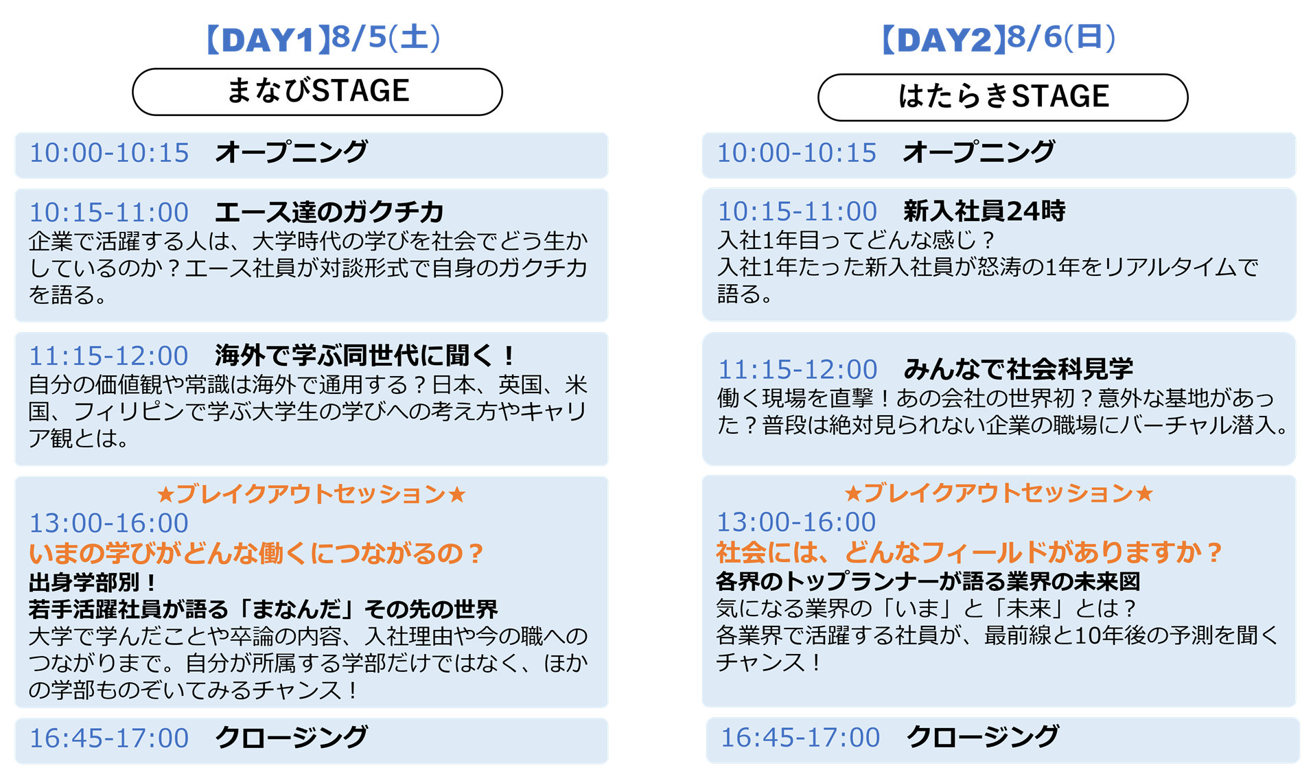 ・就活への考え方が180°変わる。何より、現場で働いている人の生の声や、様々な仕事内容について聞くことができた。そして、大学生活でどんなことをしていくと良いのか、それが今後の人生でどう影響を与えるのか知ることができた。