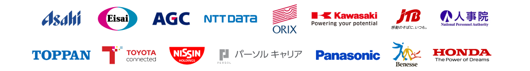 アサヒビール株式会社、エーザイ株式会社、AGC株式会社、株式会社NTTデータ、オリックス株式会社、川崎重工業株式会社、株式会社JTB、人事院、TOPPAN株式会社、トヨタコネクティッド株式会社、日清食品ホールディングス株式会社、パーソルキャリア株式会社、パナソニックグループ、株式会社ベネッセコーポレーション、本田技研工業株式会社、他 ※五十音順