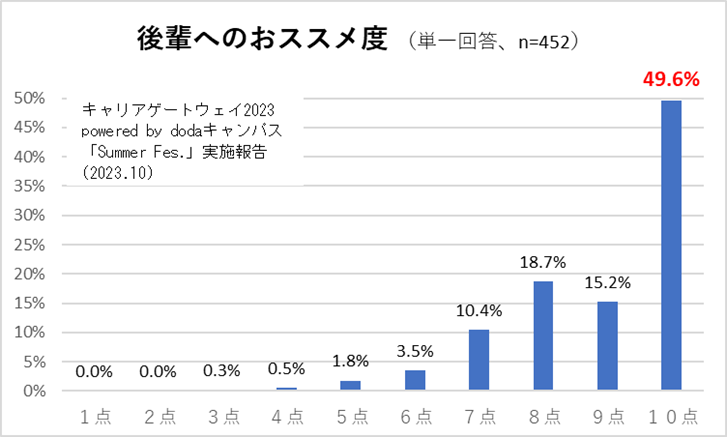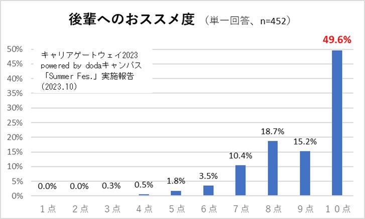 参加大学生の約半数が、後輩へのおススメ度「10点満点」と回答
