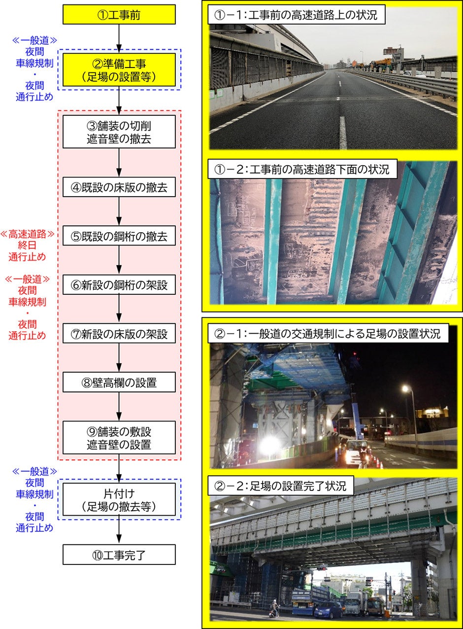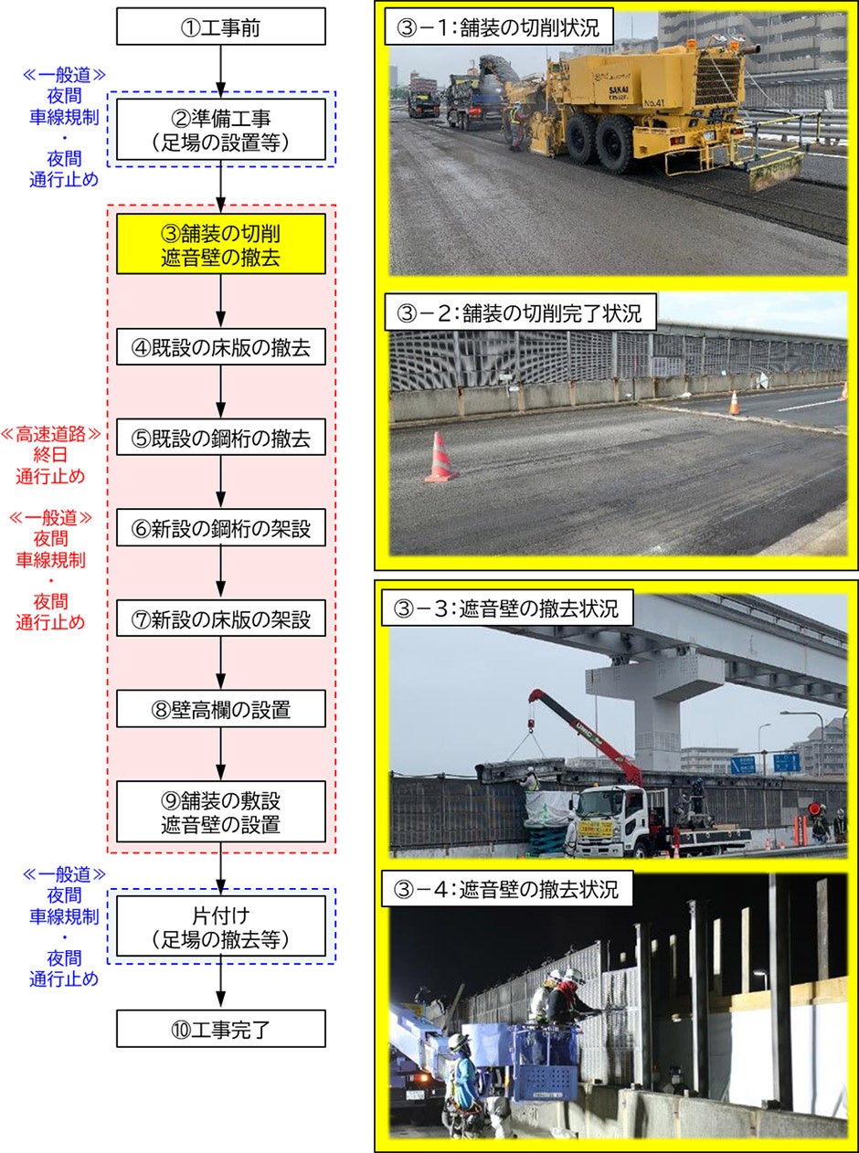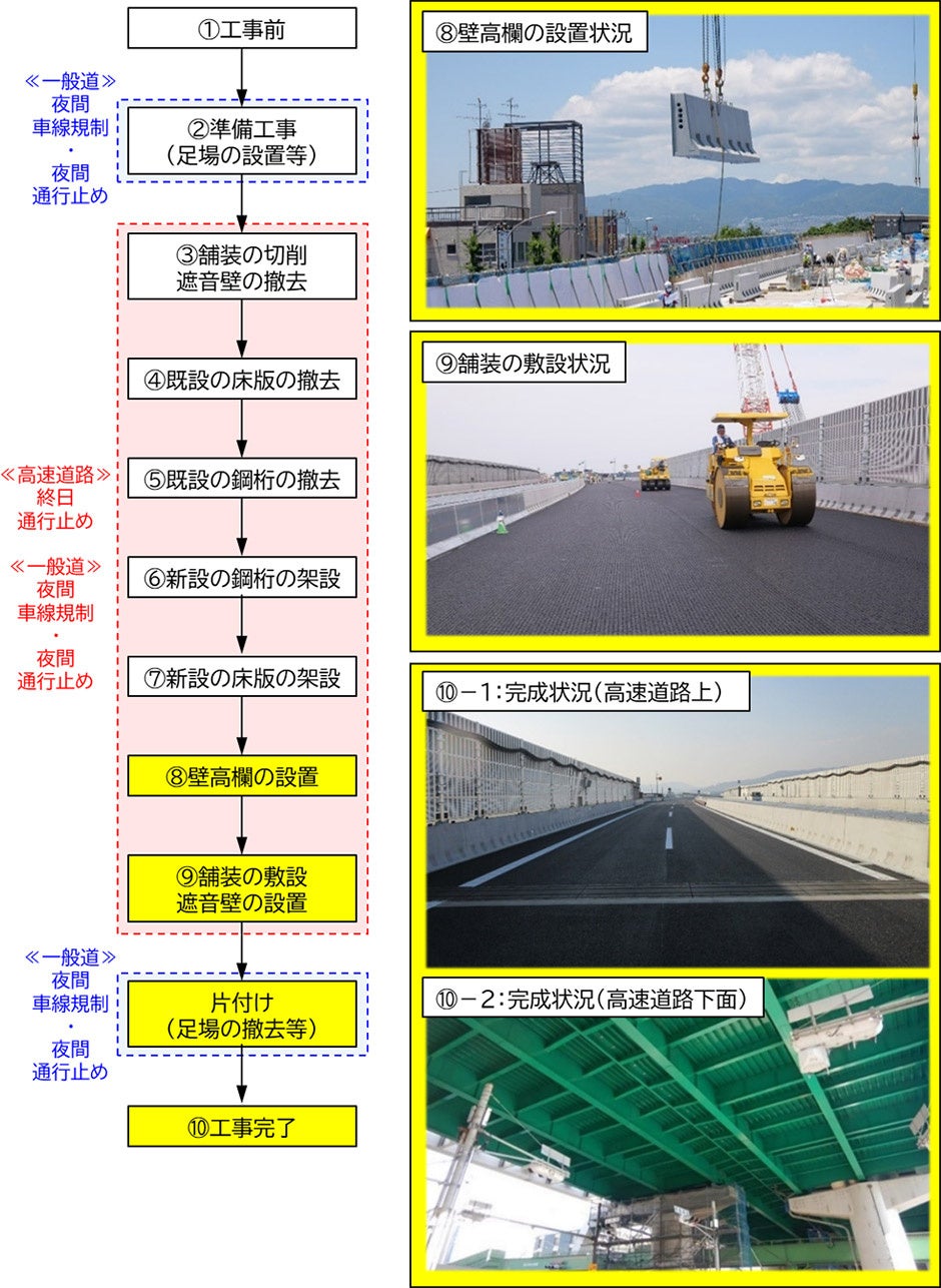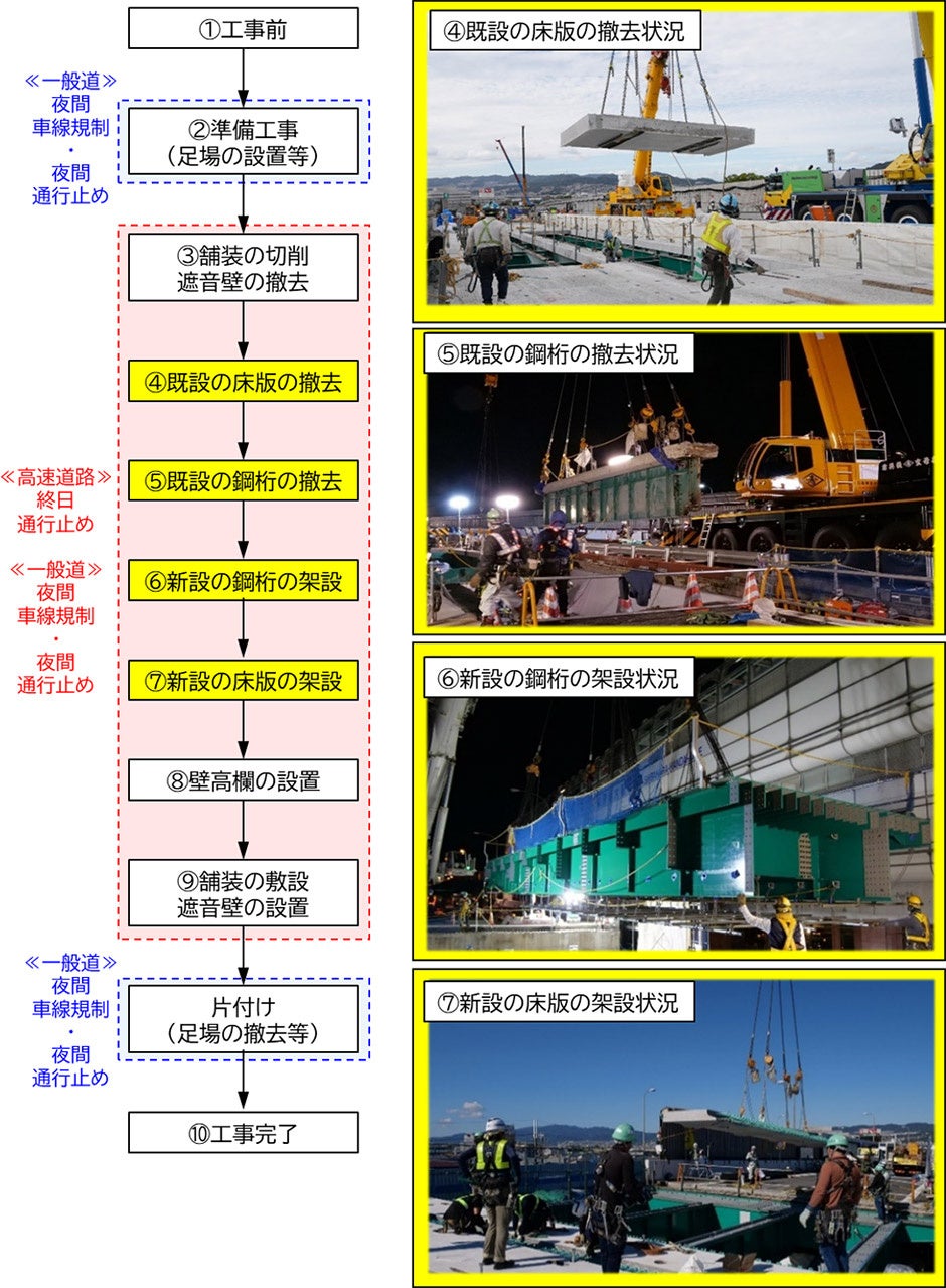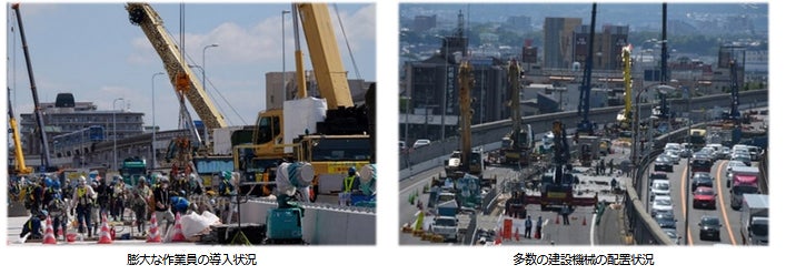 NEXCO西日本では初となる長期間の終日通行止めであり、新技術・新工法の積極採用による工事期間の