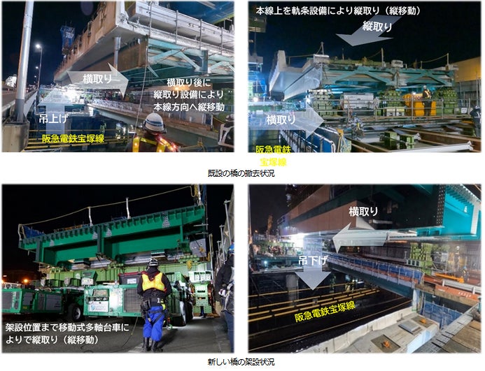 阪急宝塚線と交差している場所では、縦方向・横方向に吊上げ設備を動かして橋を架け替えました。