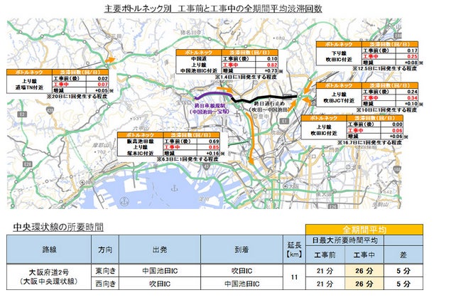 となっており、交通量の増加による大きな影響は見られませんでした。大阪中央環状線においても工事前と