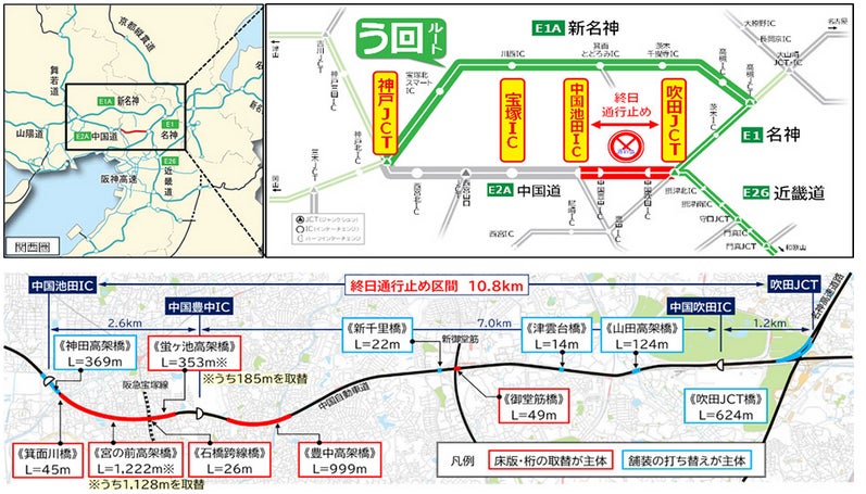 NEXCO西日本(大阪市北区、代表取締役社長:前川 秀和)では、安全・安心・快適を未来につなげるため、高速道路の長寿命化に向けた「高速道路リニューアルプロジェクト」に取り組んでおり、令和2年度よりE2A中国自動車道(E2A中国道) 吹田ジャンクション(JCT)~神戸JCT間で大規模なリニューアル工事を行っております。