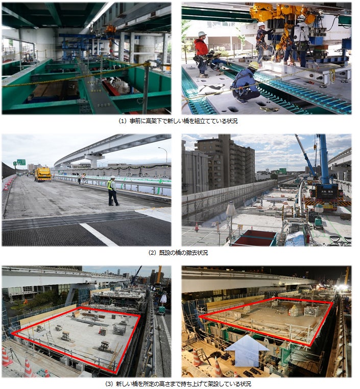 (3)新しい橋を所定の高さまで持ち上げて架設する工法です。通行止め前に高架下で組立てを進める