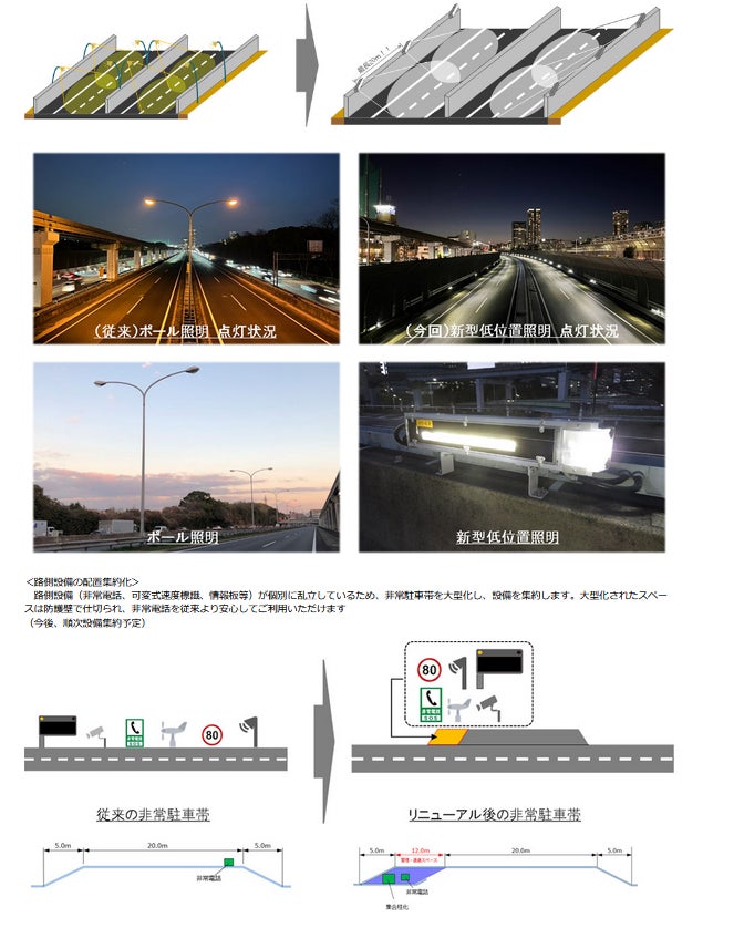 走行時の視認性向上、照明倒壊リスク排除およびメンテナンス省力化のために新型低位置照明を導入します。従来は高さのある照明ポールの点検において周囲の安全のために高速道路に並走する一般道の交通規制も必要でしたが、新型低位置照明はLEDの精密な配光制御により、低位置から広スパン(設置間隔)で従来と同等以上の視環境(明るさ)を実現しており、照明倒壊リスクの排除および点検等のメンテナンスの省力化に加え、一般道の規制回数を減らすことが可能になるとともに、設置コストや消費電力の削減にも寄与しています。(今後、順次設置予定)