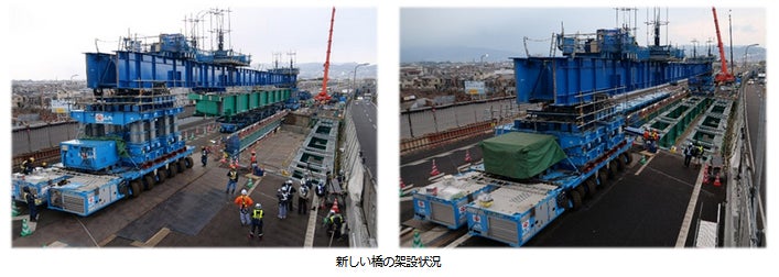 使って既設の鋼桁の直下まで持ち上げ、(2)終日通行止めの開始とともに既設の橋を撤去した後