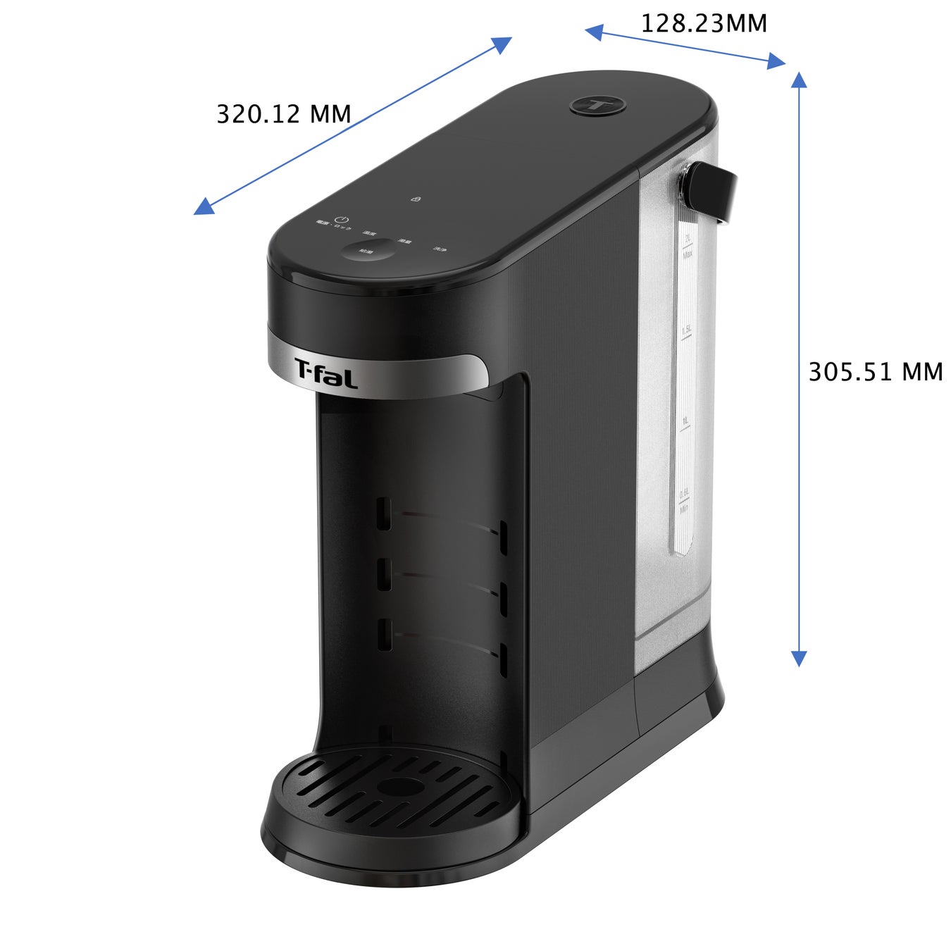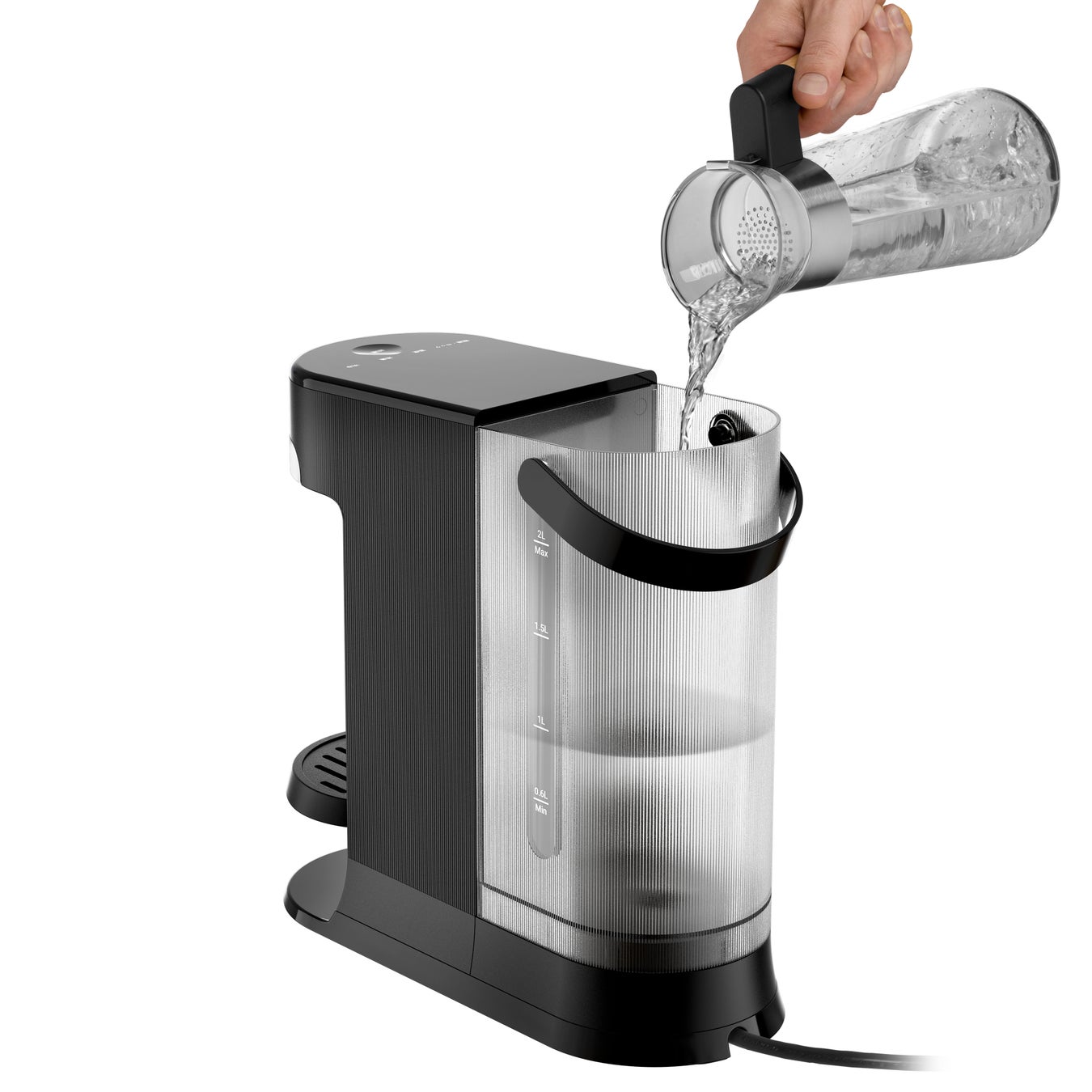 本体の幅は約13cmとスリムな設計で、キッチンカウンターやワークスペースの隙間に置くことができ、置き場所に困らず、インテリアに溶け込むデザインです。水タンクは2Lの大容量で最大約12杯分(※1)のお湯が給湯できます。タンクは取り外し可能で取っ手が付いており、水道口まで持ち運びができて、給水や排水も簡単です。