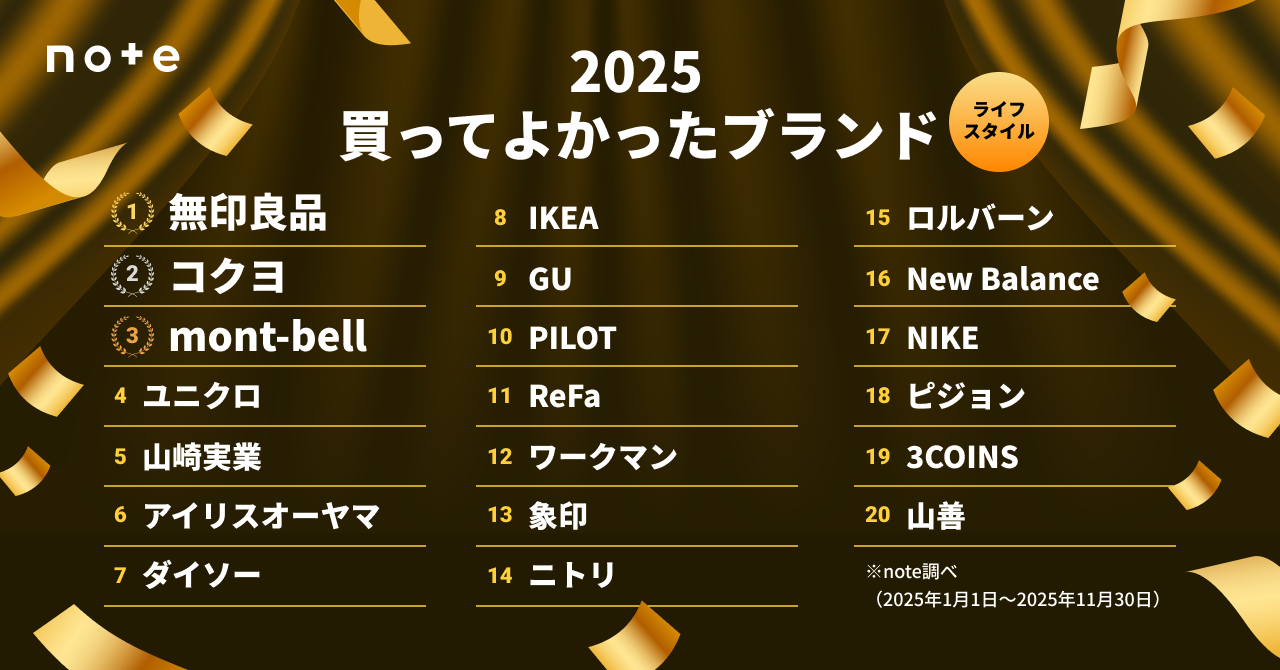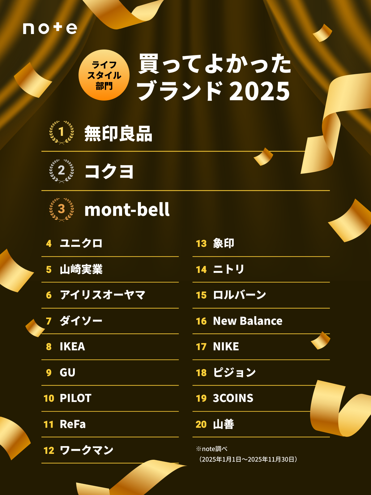 ライフスタイル部門の第1位は、暮らしに寄りそうブランドとして愛される「無印良品」。第2位は、仕事や学びの時間を心地よく楽しくする「コクヨ」。第3位は、機能性とミニマルなデザイン、使い心地の良さが共感を呼ぶ「mont-bell」でした。ここでは、上位ブランドについて、noteに投稿された「買ってよかった」記事の一部をご紹介します。