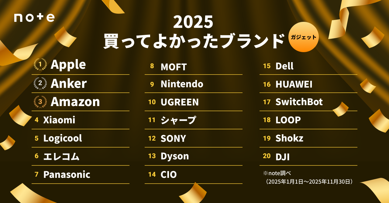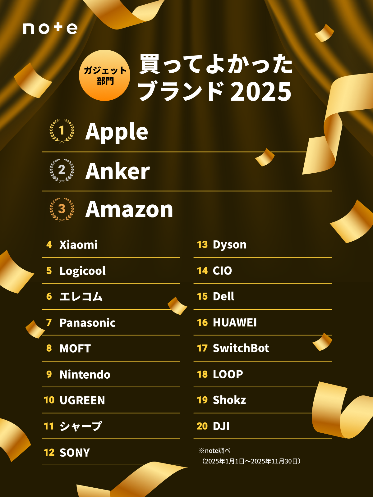 ガジェット部門の第1位に輝いたのは、創作や暮らしに欠かせない存在として共感を集める「Apple」。第2位は、機能性と手頃さで多くのひとに選ばれつづける「Anker」。第3位は、暮らしを変える製品として期待が語られている「Amazon」となりました。ここでは、上位ブランドについて、noteに投稿された「買ってよかった」記事の一部をご紹介します。