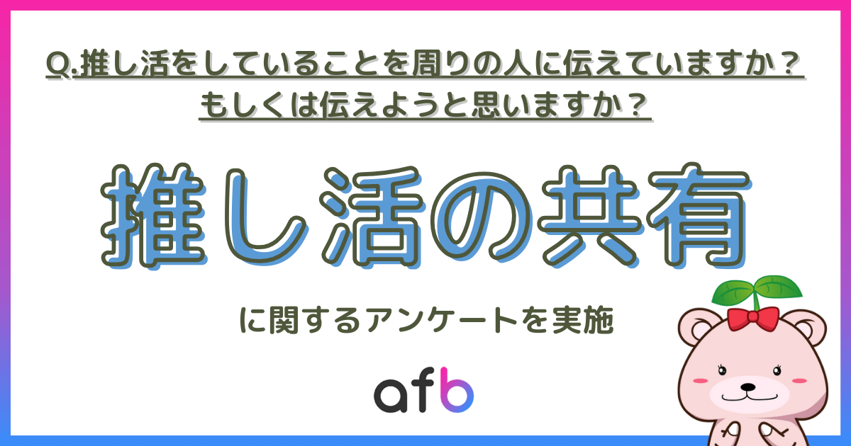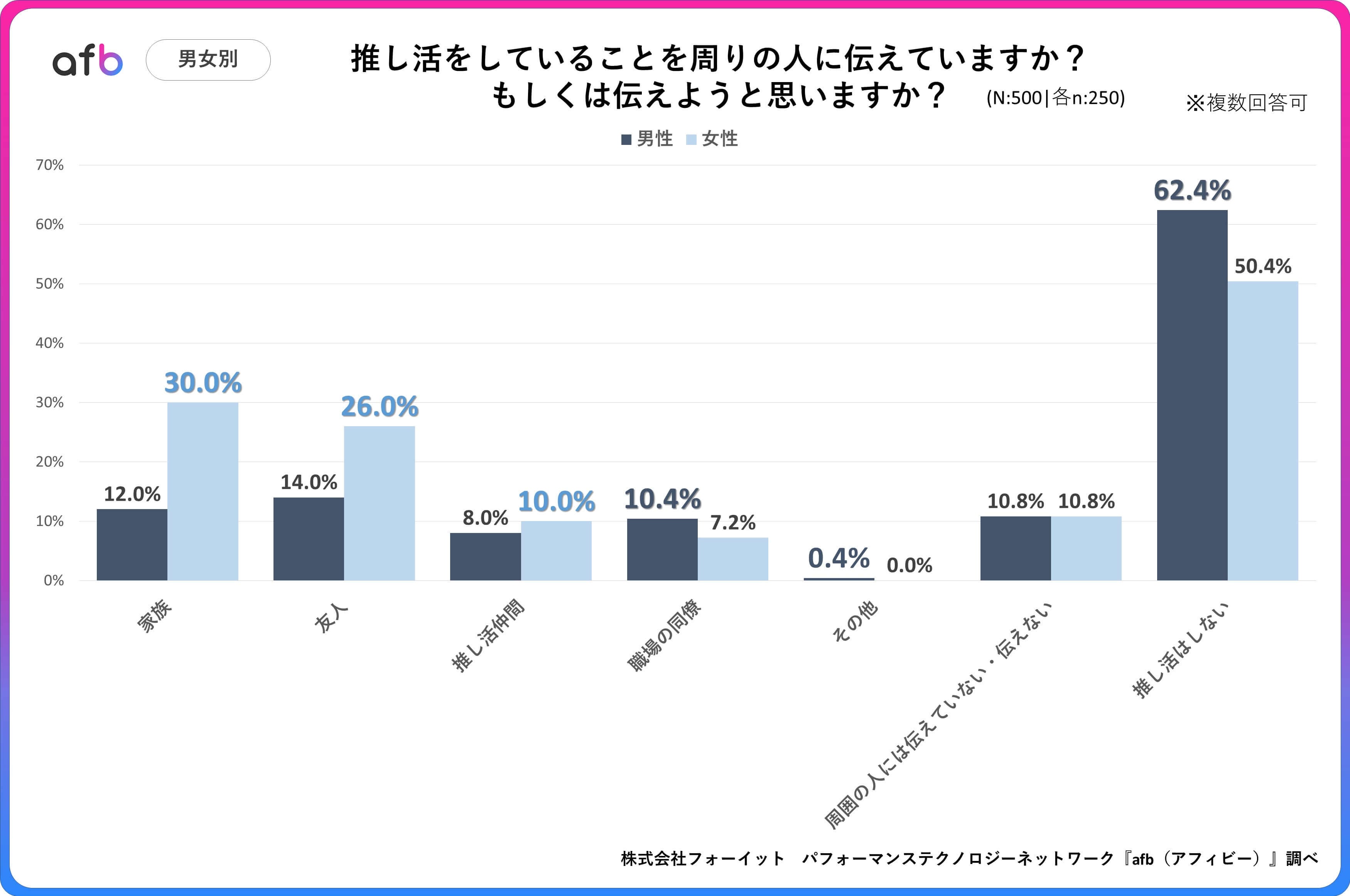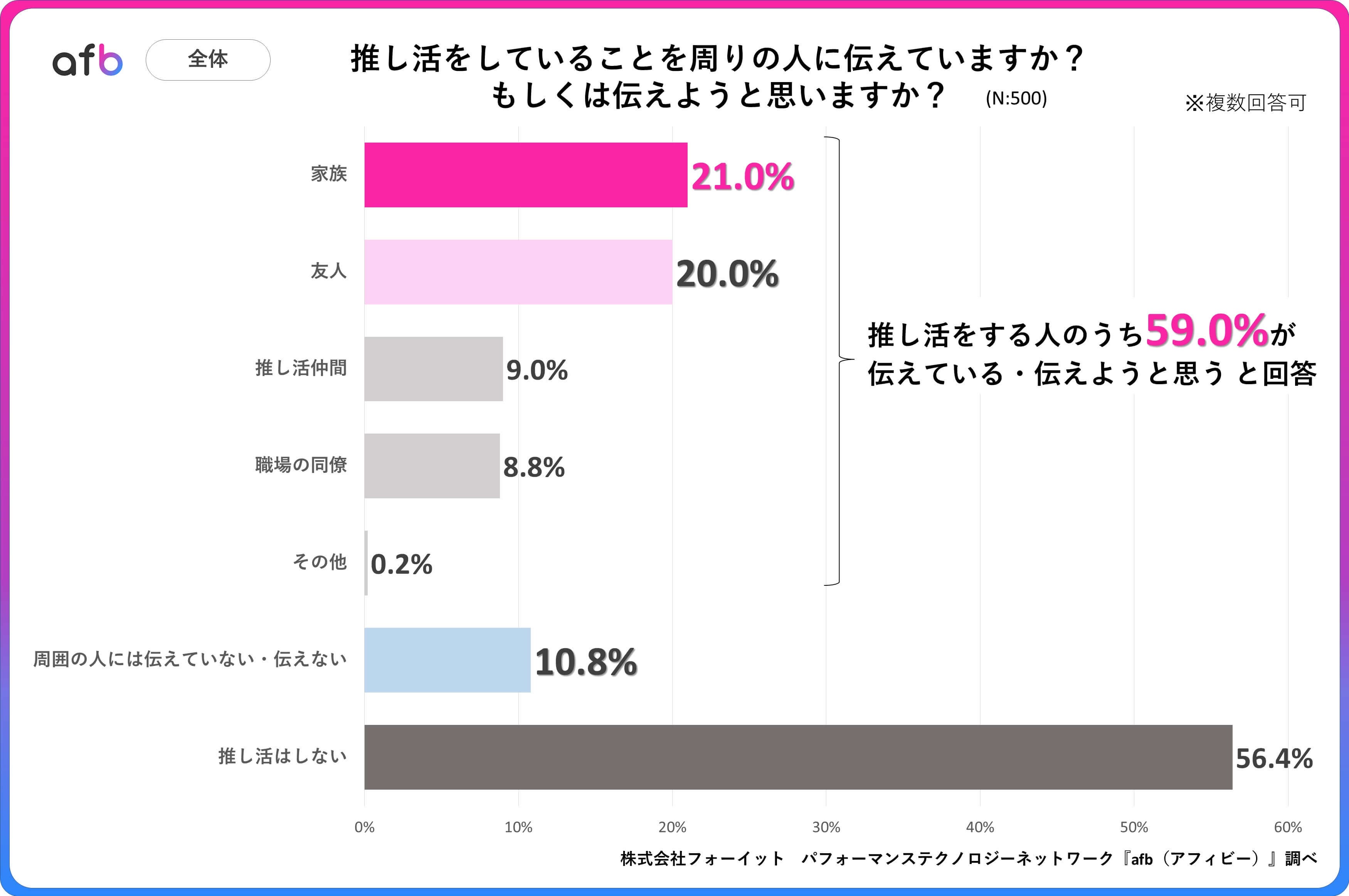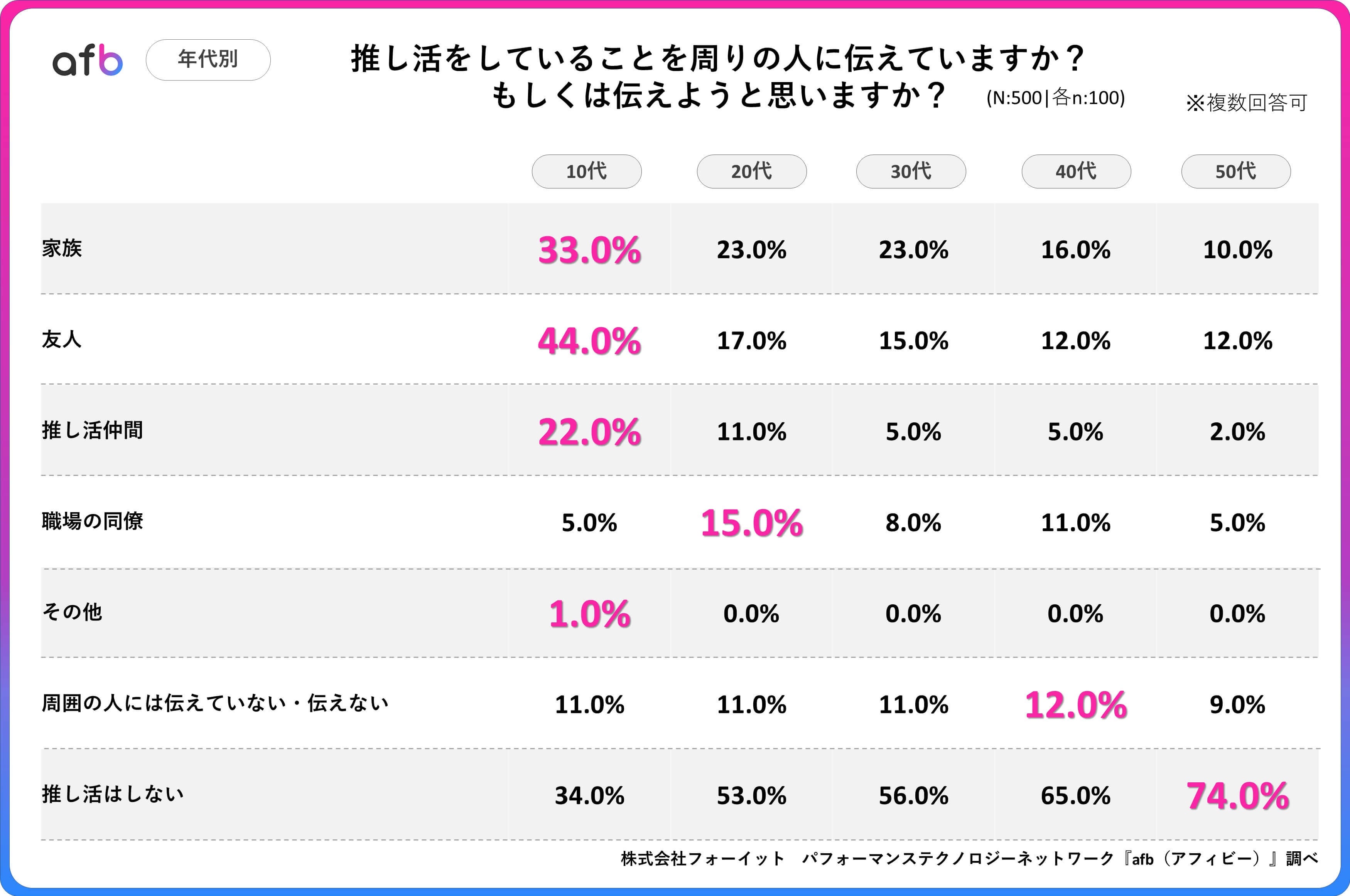 パフォーマンステクノロジーネットワーク「afb(アフィビー)」< https://www.afi-b.com/ >の開発運用をおこなう株式会社フォーイットは、全国の10代~50代までの男女500人を対象に推し活に関するアンケートを実施し、年代別・男女別等の特徴についてまとめました。