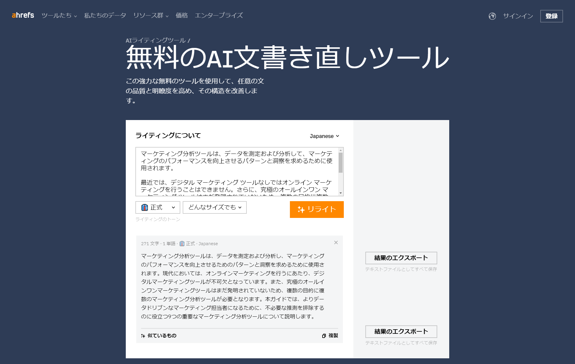 さらに、このツールは英語や日本語を含む複数の言語に対応しており、Ahrefs社の契約を結んでいないユーザーでも無料でご利用いただけます。効率的で高品質なコンテンツを作成するために、ぜひ一度お試しください。