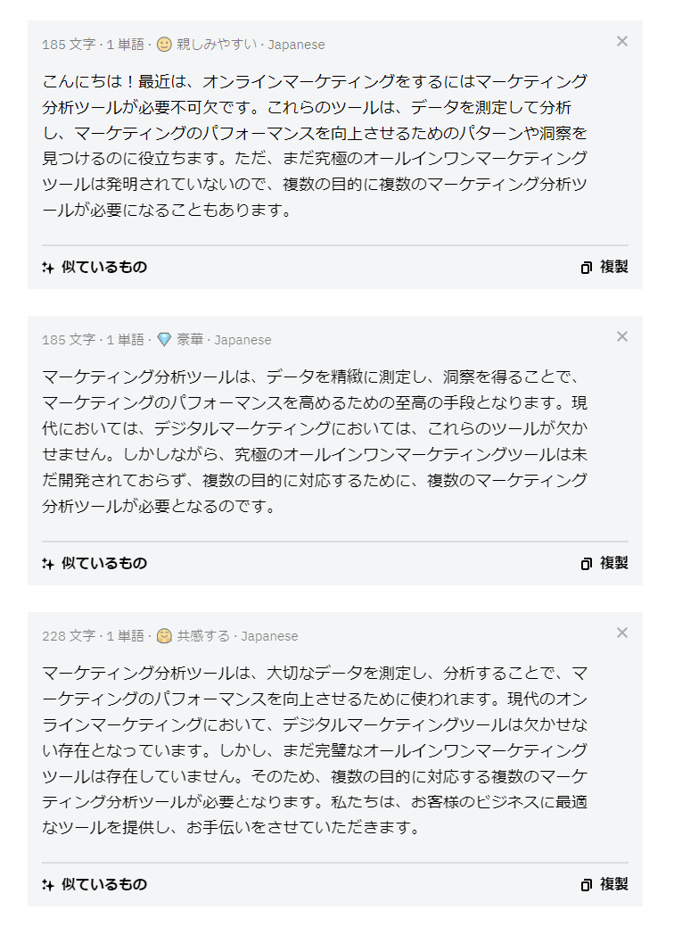 2023年9月時点で、このライティングツールは、ライティング、SEOとコンテンツマーケティング、ソーシャルメディア、ビジネス&マーケティングの4つのカテゴリにおいて、合計22種類のAIツールを提供しています。今後も新しいツールの追加が予定されており、多彩な用途に対応する予定です。