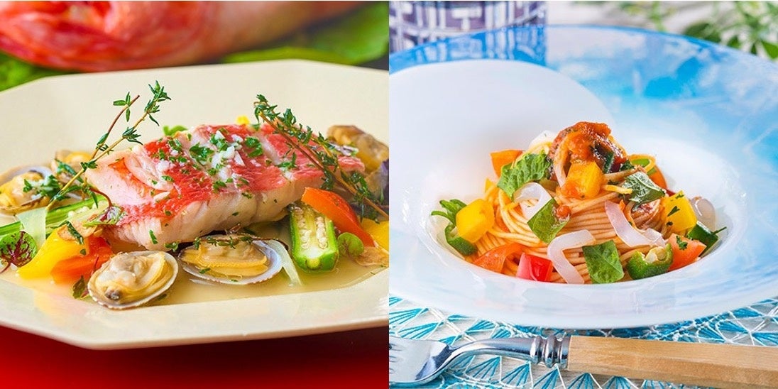 金目鯛と夏野菜のポシェ/イカと夏野菜の冷製カッペリーニ