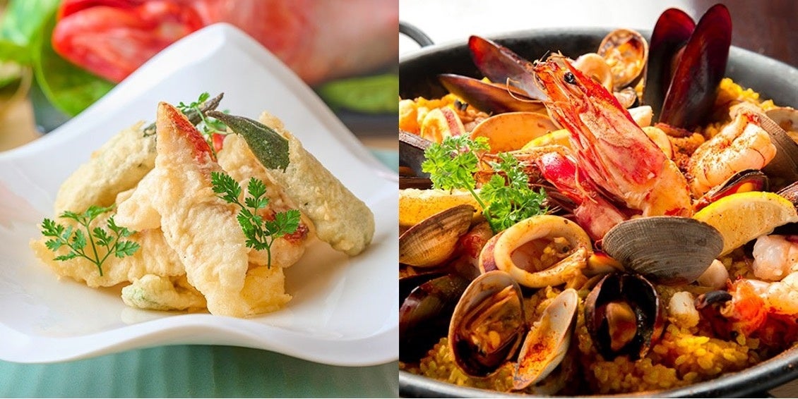 ライブキッチンから揚げたてをご提供するアジフライや金目鯛の天ぷら、海鮮パエリアなど海鮮グルメをたくさんご用意しています。金目鯛の天ぷらは、魚の旨みを閉じ込めた、ふわっとした身とサクッと揚がった食感がたまらないおすすめの1品です。