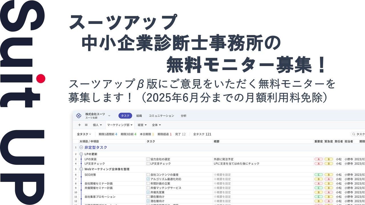 株式会社スーツ(所在地:東京都千代田区、代表取締役社長CEO:小松 裕介)は、チームでかんたん、チームのタスク管理・プロジェクト管理ツール「スーツアップ」において、中小企業診断士事務所の無料モニターを募集いたします。