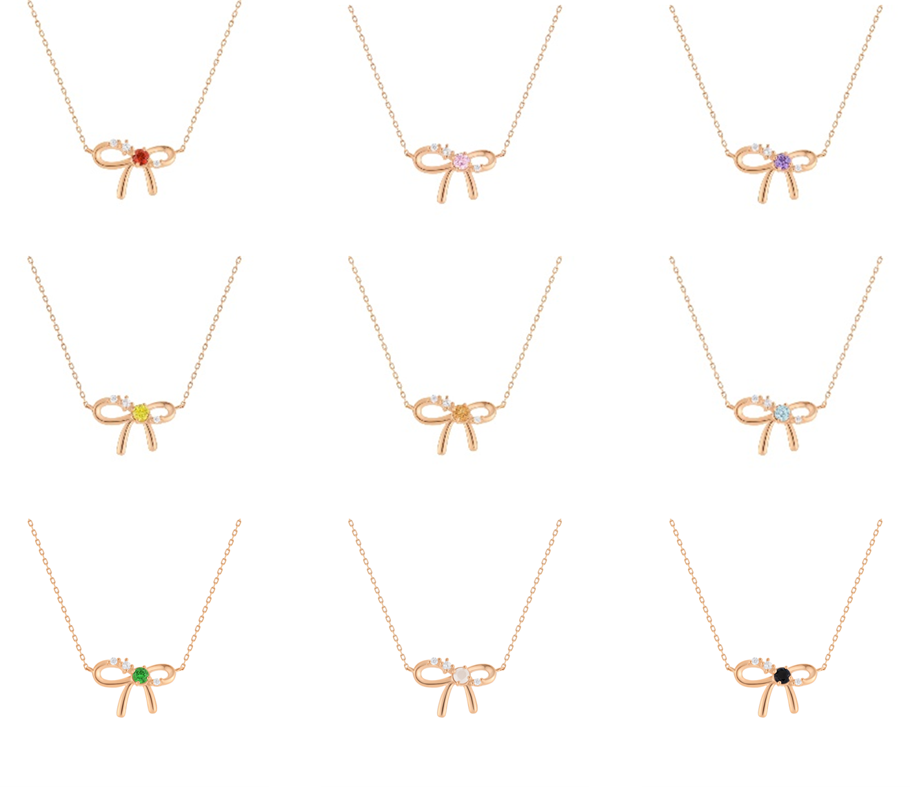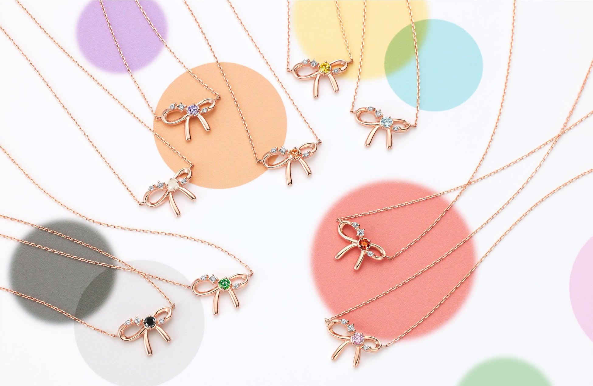 第2弾となる今回は、9色の推しカラーのストーンを包み込むリボンモチーフのネックレスや、お気に入りの写真を入れていつも推しを身近に感じられるロケットネックレスなど、推し活ならではの想いに寄り添うジュエリーが登場。さらにノベルティーには、アクリルスタンドにかけられる専用の小さなネックレスが登場。お揃いのリボンのネックレスで推しとのペアネックレスとしてお楽しみいただけます。