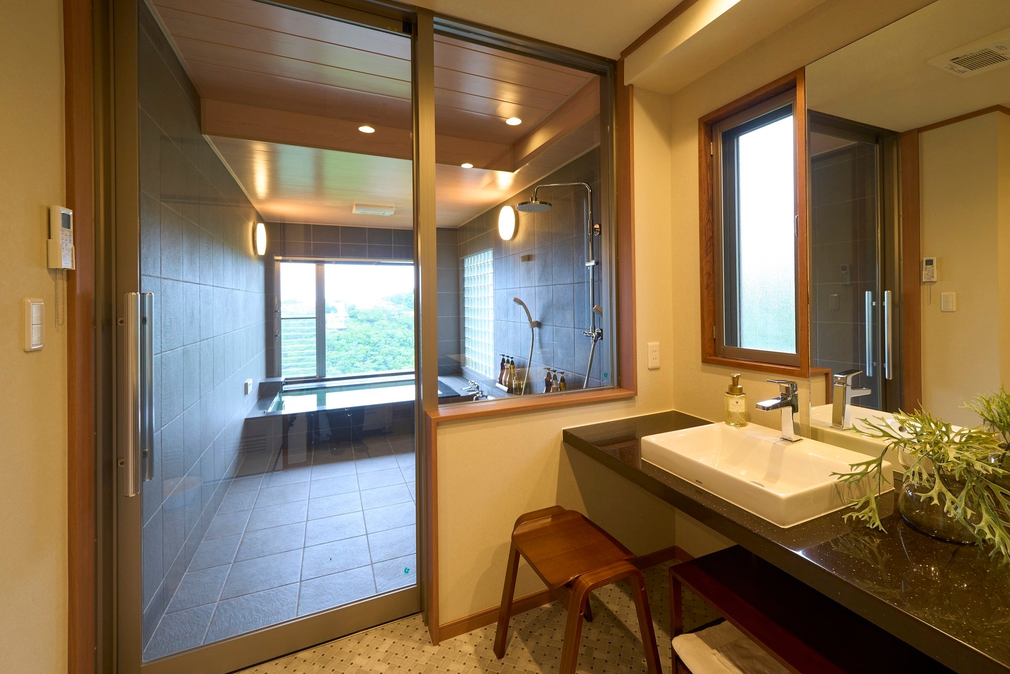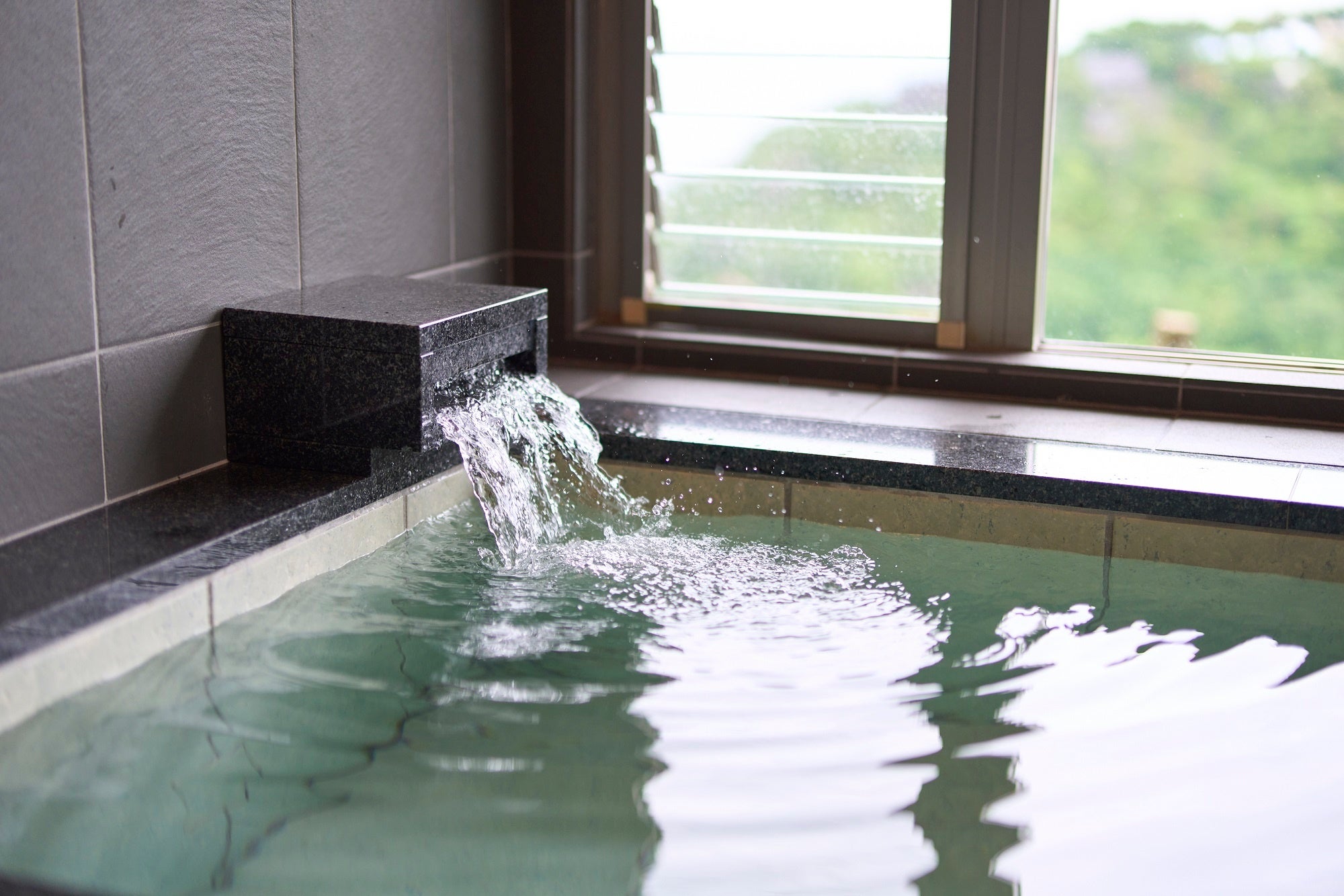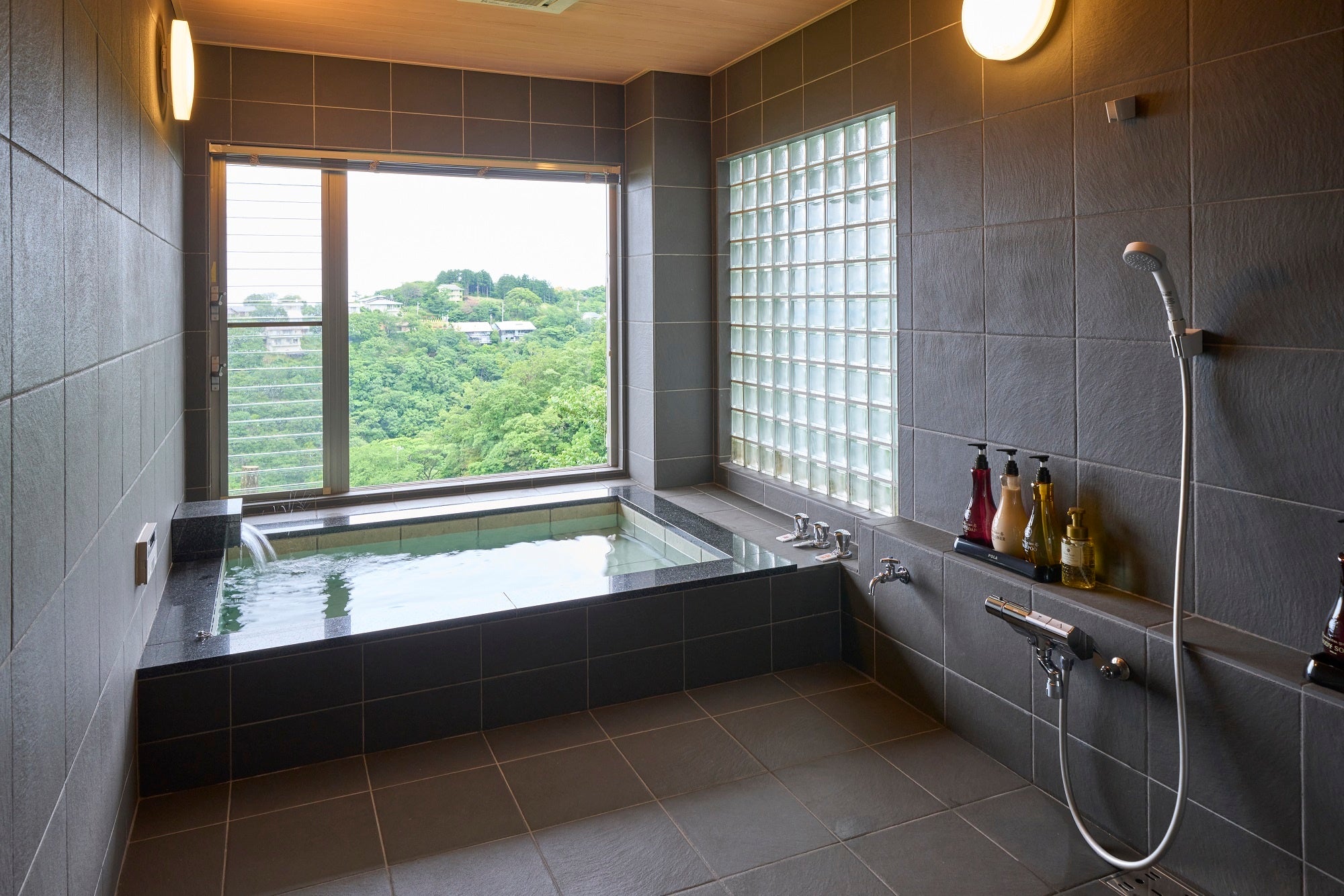 カルシウム―硫酸塩温泉を引き込む浴室は、鎮静効果が高く、「脳卒中の湯」といわれ、高血圧や動脈硬化などに効果があり、また、肌の蘇生効果から「若返りの湯」ともいわれる泉質です。温泉につかりながらの相模湾の眺めは、一層のリラックス効果を高めてくれるでしょう。半身浴も楽しめるよう浴槽内に段差を設けています。脱衣室とはガラス張りで開放感にあふれ、広い洗い場と大きな浴槽は、家族一緒に温泉を楽しむこともできます。カランを2か所ご用意し、レインシャワーも完備しています。温泉のみならず、バスタイムを楽しめる快適な設備を備えています。