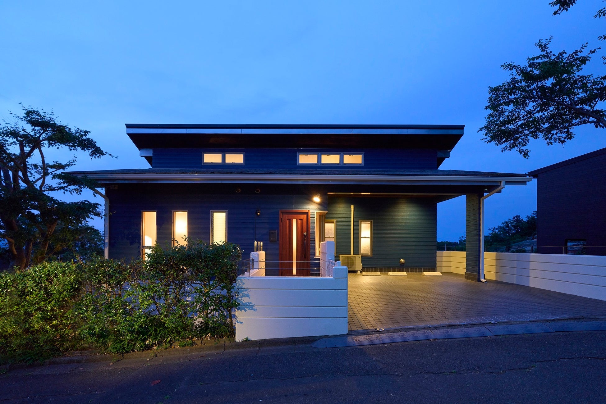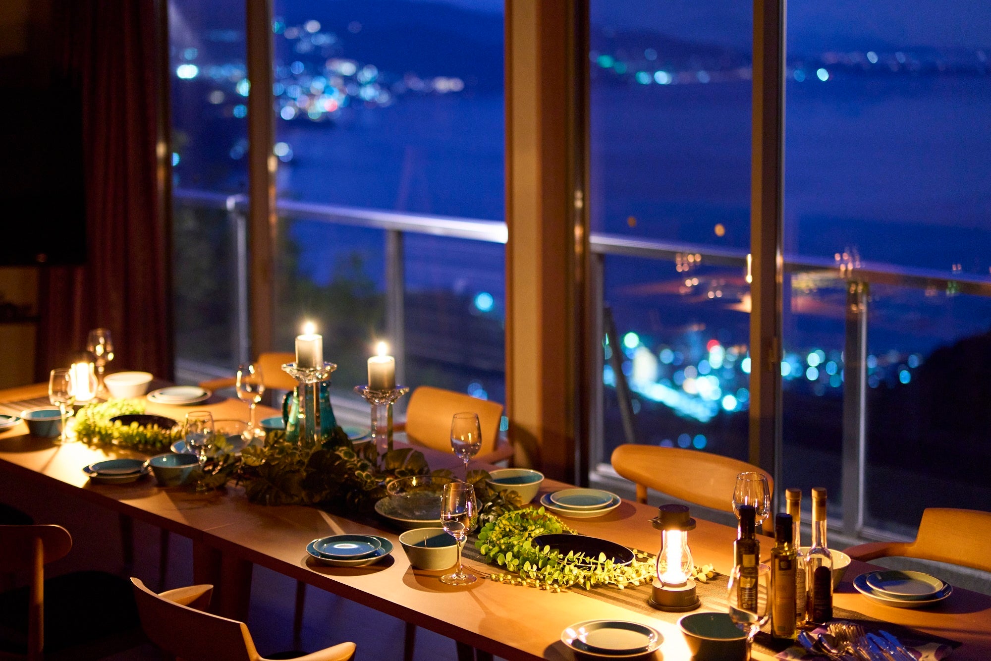壁一面を覆うカーテンを開けると、高さ2.4m横5.4mのサッシはさながらスクリーンのように相模湾を一望する景色を透過し、言葉を失う迫力です。また、高さ約5mの勾配天井とむき出しの梁は、室内とは思えない開放感を与えてくれます。その空間に存在感を放つのは、3.6mの大きなダイニングテーブルと10脚の椅子たちです。ソファーより一段高い目線で、長時間景色を堪能していただきたいという想いから、飛騨産業㈱の「立ち上がりたくない椅子」としてTV等で話題となった座り心地に定評がある椅子を配置しました。気に入った場所で、気に入った椅子でくつろぎの時間をお愉しみください。